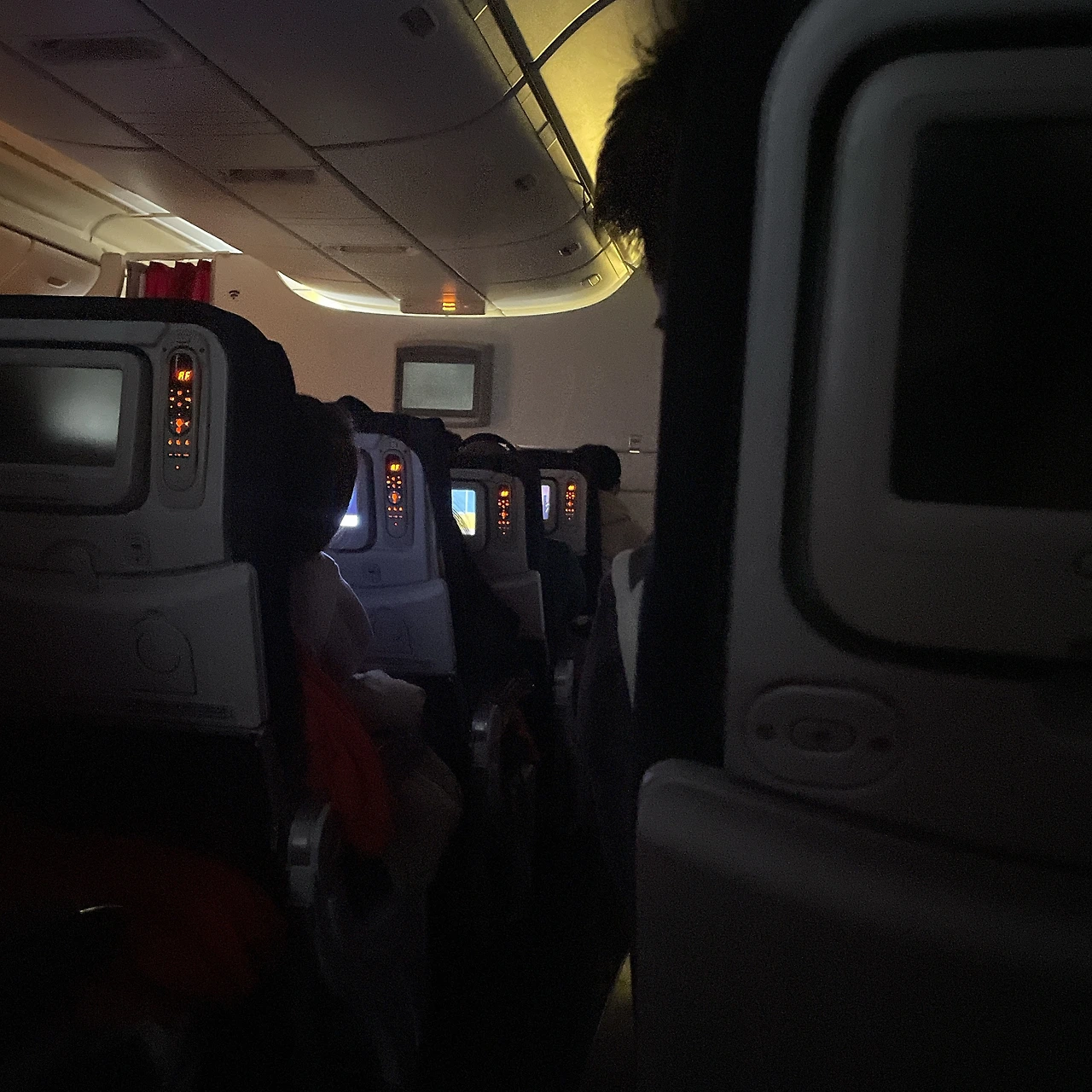 그런데 때마침 아까 옆자리에 앉은 젊은 남자가 내게 말을 붙였다. 그는 “식사 안 하시는 거예요?”라며 걱정스럽게 물었고 나는 “아 저 이미 하고 와서”라고 대답했다. 다시 이어폰을 끼고 노래를 들었다. 다른 사람들의 식사시간이 얼추 종료된 뒤 승무원들은 빈 그릇을 챙겨갔고 비행기의 불은 소등되었다.