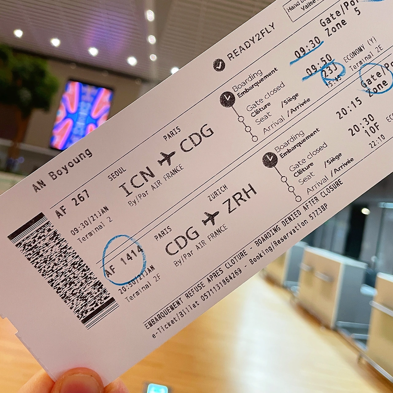 스위스로 향하는 이번 비행길에서는 파리까지 14시간 비행기를 타고 가 샤를드골 공항에서 5시간 대기한 뒤 또다시 취리히 공항으로 날아가야 했다. 경유 일정이 끼어있는 만큼 꽤 피곤한 여정이 될 듯싶었지만 그럼에도 불구하고 4년 만에 떠나는 유럽행을 앞둔 내 마음에는 두근거리는 설렘만이 가득했다.