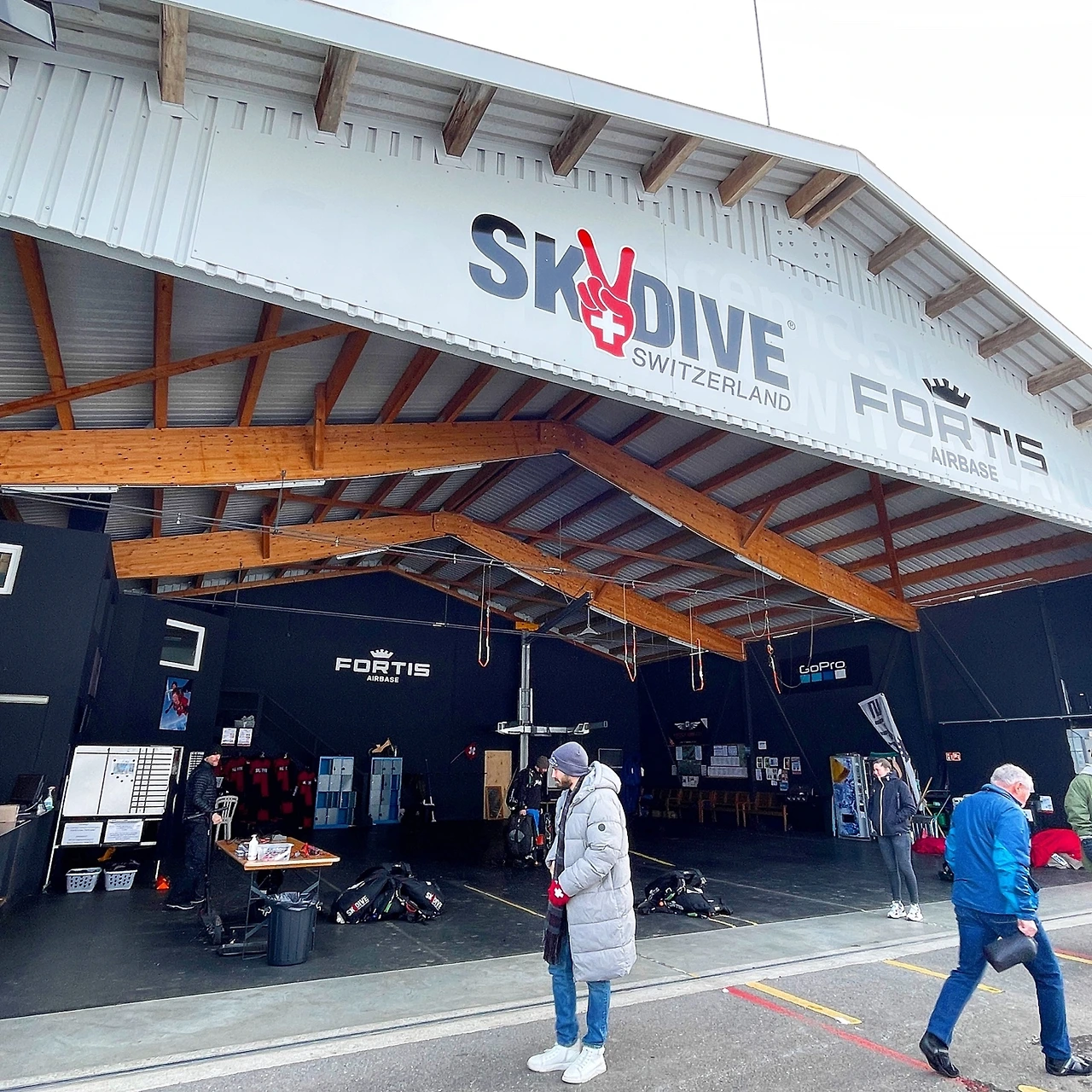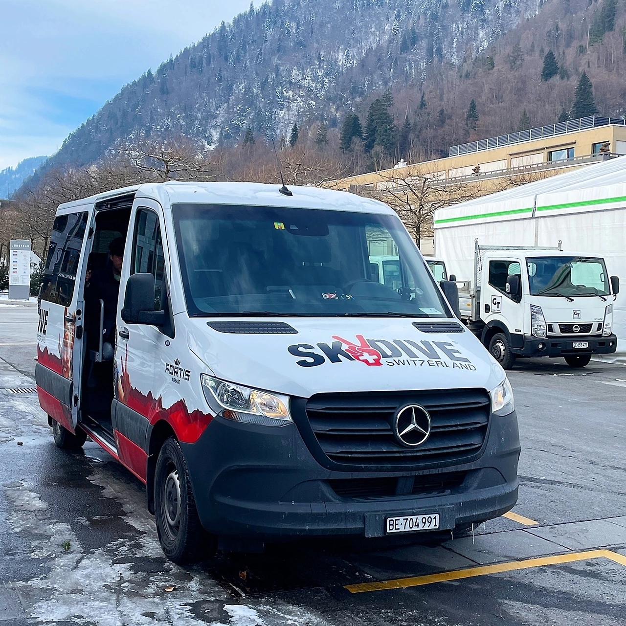 오늘은 스위스에서의 마지막 날이기에 모든 짐을 챙겨 숙소를 나왔다. 무거운 가방 두 개를 짊어지고 패딩을 껴입은 채 전날 갔던 스카이다이빙 집결지, 인터라켄 동역 Coop마트로 다시 향했다. 집결시간은 마찬가지로 낮 12시. 혹시라도 또다시 직전에 취소메일이 올까 봐 11시 45분에도 50분에도 계속해서 메일함을 열어보았다. ‘새로 받은 메일’ 폴더가 깨끗한 것이 내 마음을 놓이게 했다. 집결지에 서서 버스를 기다리며 계속해서 하늘을 올려다보았다. 하늘은 더할 나위 없을 정도로 쾌청하고 맑았다. 11시 55분쯤이 되어 하나둘씩 집결지 근처로 모여드는 한국인들이 눈에 띄기 시작했다. 이제야 마음이 놓였다. 그리고 드디어 12시가 되자마자 마치매 SKYDIve SWITZERLAND라고 적힌 봉고차가 나타났다.