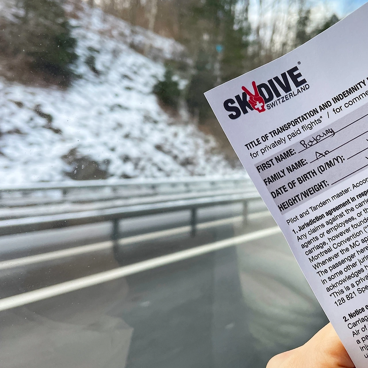 인터라켄 동역에서만 여덟 명의 사람을 태운 뒤 흰색 봉고차가 출발했다. 다이빙장소까지 가는 25분 정도의 시간 동안, ’ 사고가 발생하더라도 책임을 묻지 않겠다 ‘라는 무시무시한 조항이 담긴 규정과 60만 원가량의 스카이다이빙 비용, 그리고 카메라 촬영에 따르는 20만 원 정도의 추가 비용에 동의한다는 서류를 작성했다. 혼자온 사람이 나를 포함해 서넛 정도, 그 외에 몇 팀은 커플도 섞여있었다. 대부분이 한국인이었다.