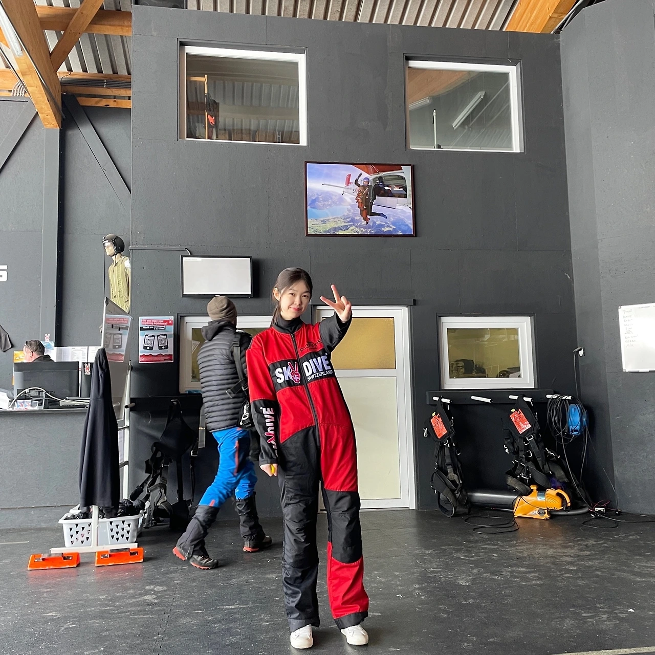 기초교육을 받고 글러브와 넥워머를 쓰자마자 직원은 도전자 중 첫 번째로 내 이름을 호명했다. 20명의 사람은 총 세 팀으로 나뉘어 비행기에 탑승하게 되는데 나는 그중 첫 번째 팀, 다섯 번째로 뛰게 되는 멤버였다. 맙소사. 마치 오징어게임 징검다리 게임을 앞둔 기분이었다.
