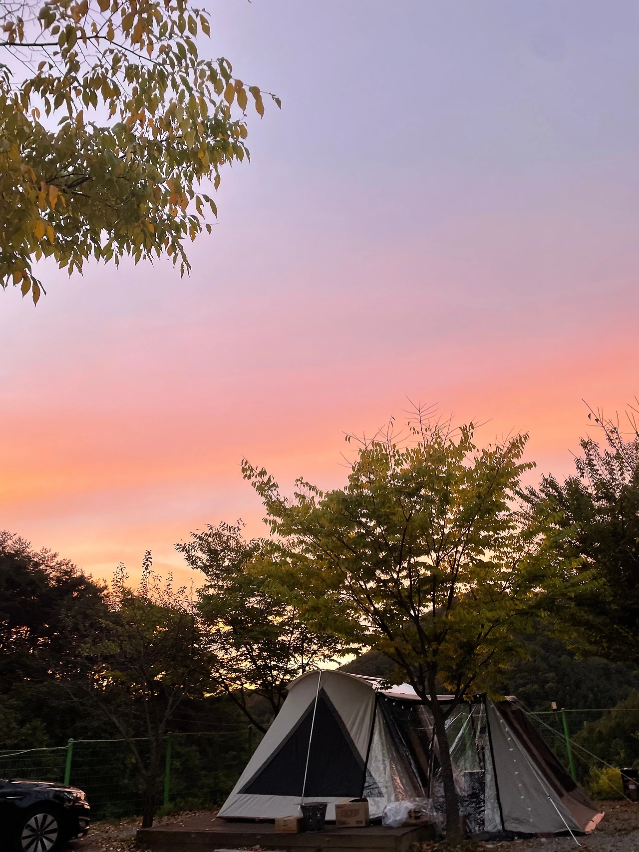 그러나, 전에 어둠 속에서도 잘 쳤던 텐트가 그날따라 왜 이리 내 맘대로 안 되는 것인지.. 사실 여러 번 씨름하면 하긴 했을 텐데 구세주처럼 캠핑장 사장님이 나타나셔서 한 번에 텐트를 세우고 치는 법을 알려주셨다. (감사합니다! 사양하지 않을게요.)