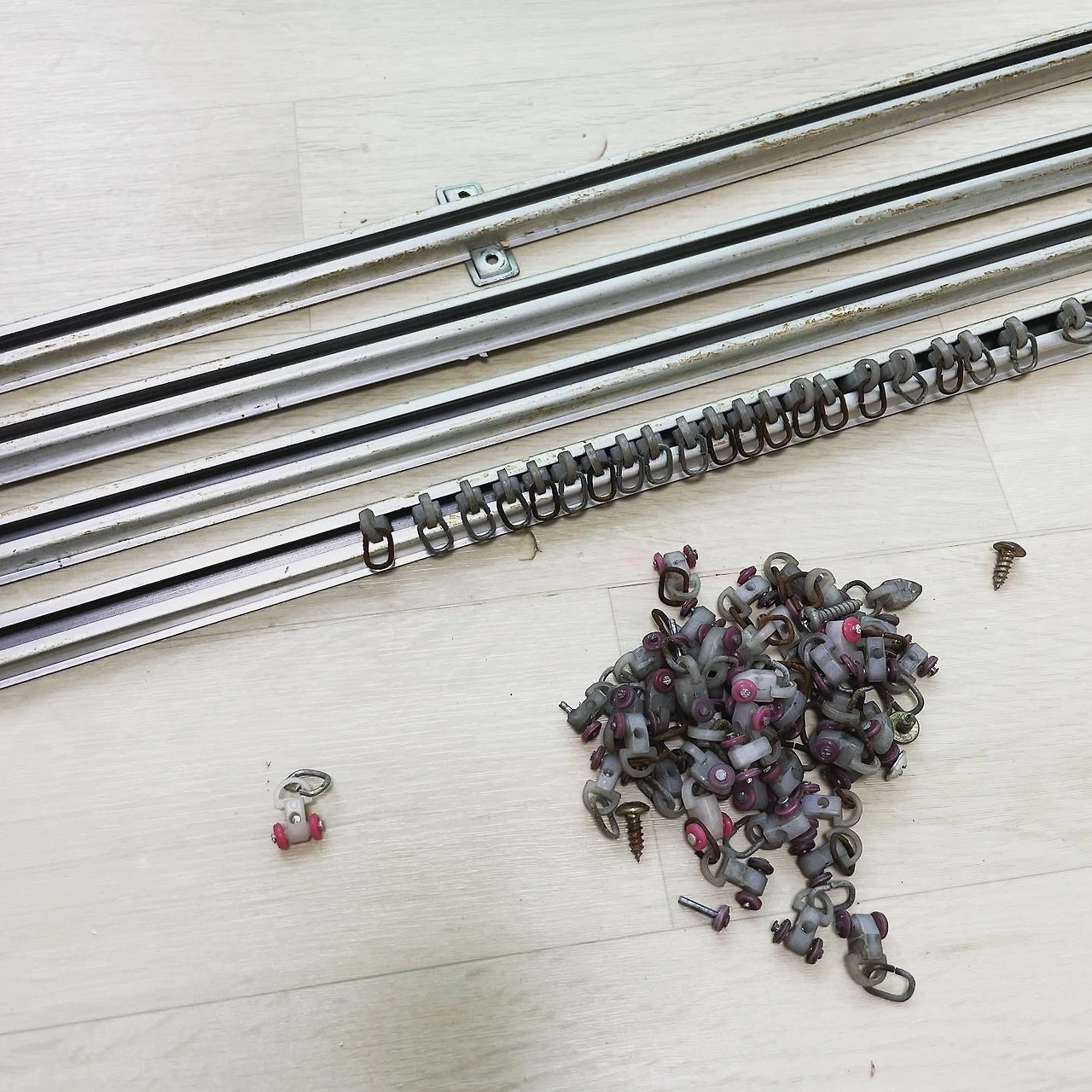 일주일 뒤, 도배 전 날 오후 반차를 내고 방에 남은 짐을 다른 방과 작은 테라스로 몽땅 옮겼다. 비 소식이 없어 다행이었다. 약 30년 된 커튼레일도 이번 기회에 교체하고자 빼니 어릴 때 참 많이 갖고 놀던 커튼 고리가 눈에 꽂힌다. 부모님께서는 커튼을 만들고, 설치하여 우리를 키웠었다. 그래서 바퀴 달린 귀여운 고리(엄마는 '로라'라고 부르신다)는 자연스레 우리의 장난감이 되었었다. 갑자기 돌아가신 아빠 생각이 나서 뭉클해진다.