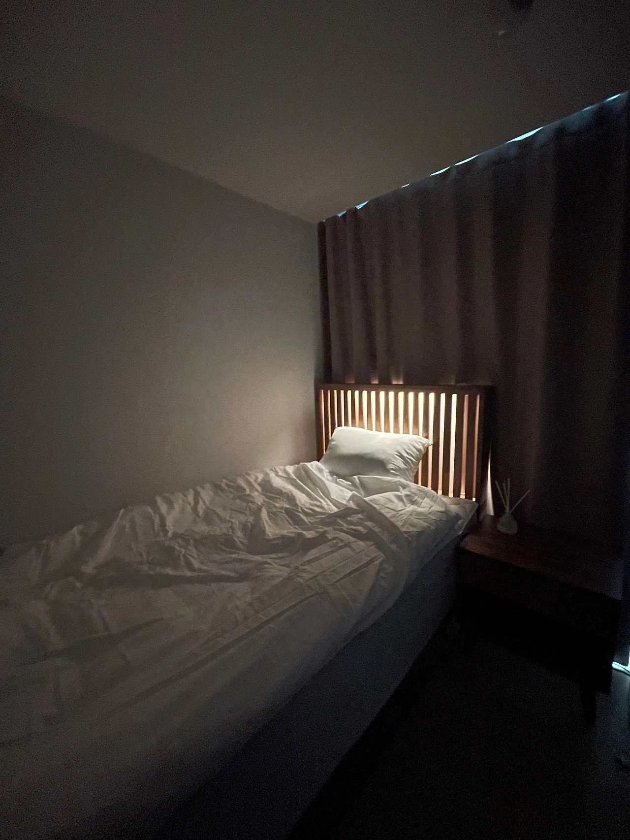디자인이 마음에 들면, 사이즈가 커서 걸린다. 어쩔 수 없이 침대는 완제품을 포기했었으나 디자인이 마음에 안 들었다. 그러다 정말 내 맘에 쏙 드는 침대를 발견했고, 사이즈 또한 세로로 분리형이 아닌, 가로로 분리된 두 개의 통판이 연결되는 형태라 계단으로 옮길 수 있었다. 게다가 은은한 조명까지! 매트리스는 라텍스로 구입했다. 스프링 매트리스는 이제 그만~ 다만, 매트리스 사면서 딸 방의 것도 바꿔주기 위해 두 개를 샀는데 쓰던 것이 좋다 하여 두 개를 얹었더니 호텔처럼 꽤 높은 침대가 되어버렸다. (쓰다 보니 마음에 든다. 딸이 다시 가져간다면 서운할 듯)