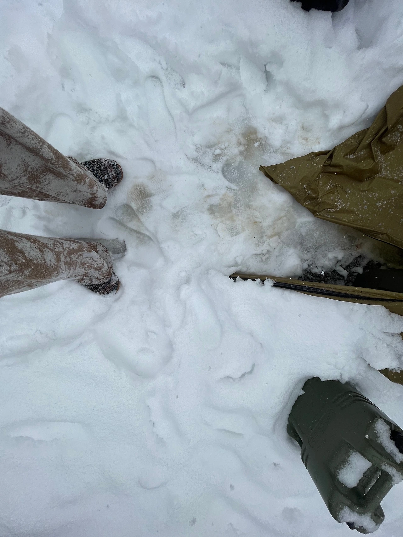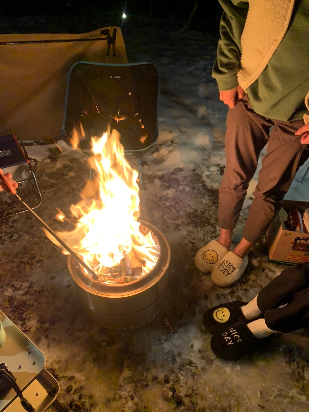 쉘터 천장에 쌓인 눈과 실내의 따뜻한 공기가 만나 천장에서 물이 뚝뚝 떨어진다. 생각보다 결로가 심한 편은 아니었으나 쉬지 않고 내리는 눈과 실내에서 떨어지는 물이 꽤 꿉꿉하다. 팬히터가 고맙기만 하다. 문제는, 베스티블! 스킨 원단이 쉘터보다 좀 얇게 느껴졌는데 역시 엄청난 결로와 습기로 꺼내놓은 짐들이 다 젖었다. 높이도 낮아 나가려면 머리로 그 물기를 싹 쓸고 가야 한다. 휴.. 이 텐트 또한 나랑은 이별이다. 결국, 야전침대에 누워 새 텐트를 지르고 말았다. 눈이 절정인 그 시각에 나 또한 돌고 돌아 결국 간다는 그곳에 가고야 말았다. (캠핑하시는 분들은 아시는 그 브랜드 맞습니다.)