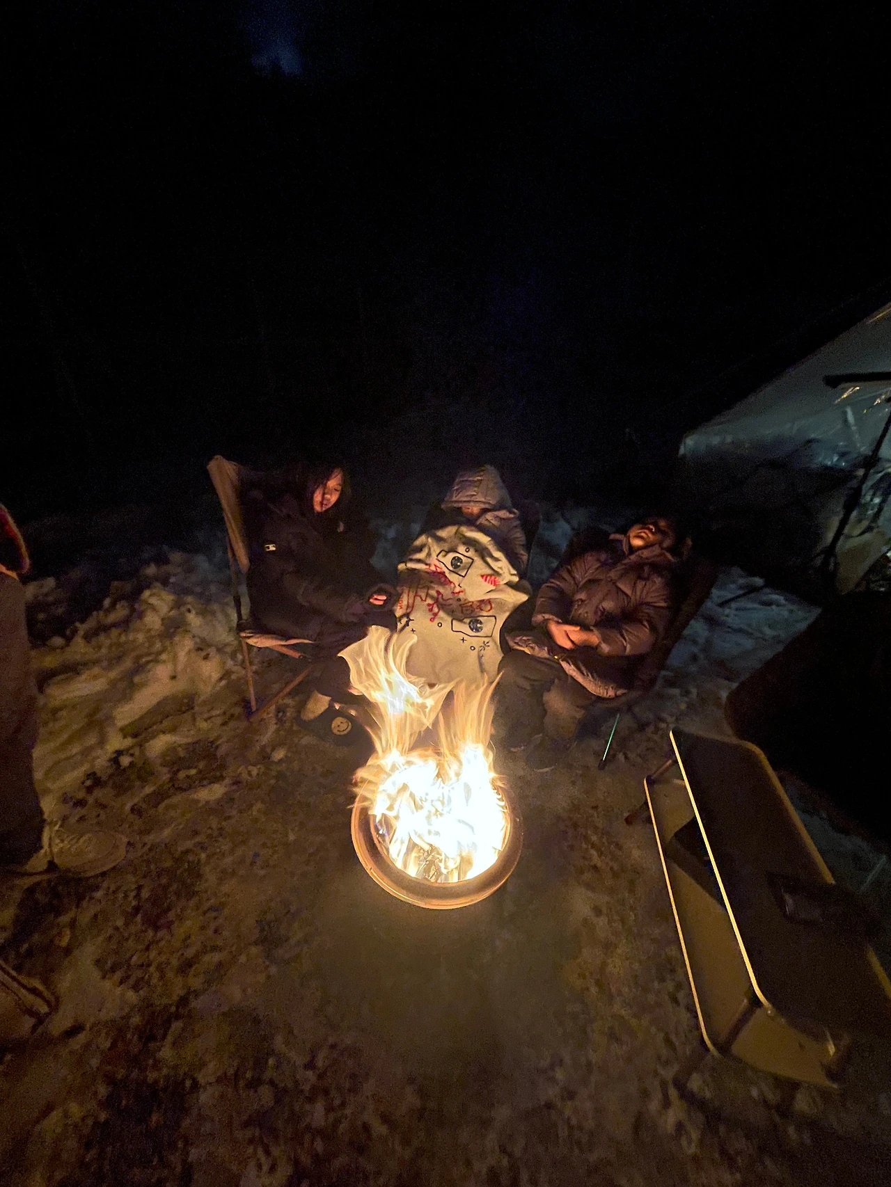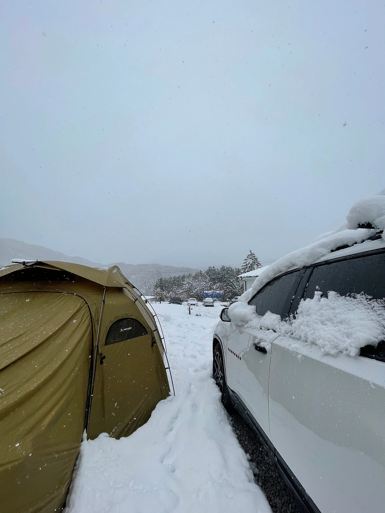 이럴 수가. 우선 큰 문을 열면 아이가 추울 거라 베스티블 쪽으로 나가려 하니 쌓인 눈의 무게와 흠뻑 머금은 습기로 스킨이 축 쳐져 기어 나가야 할 정도다. 위에선 기분 나쁘게 물이 뚝뚝 떨어진다. 밖에 나가보니 친구가 기름이 떨어졌었다며, 캠핑장에서 다행히 구매해서 기름을 넣고 있다.