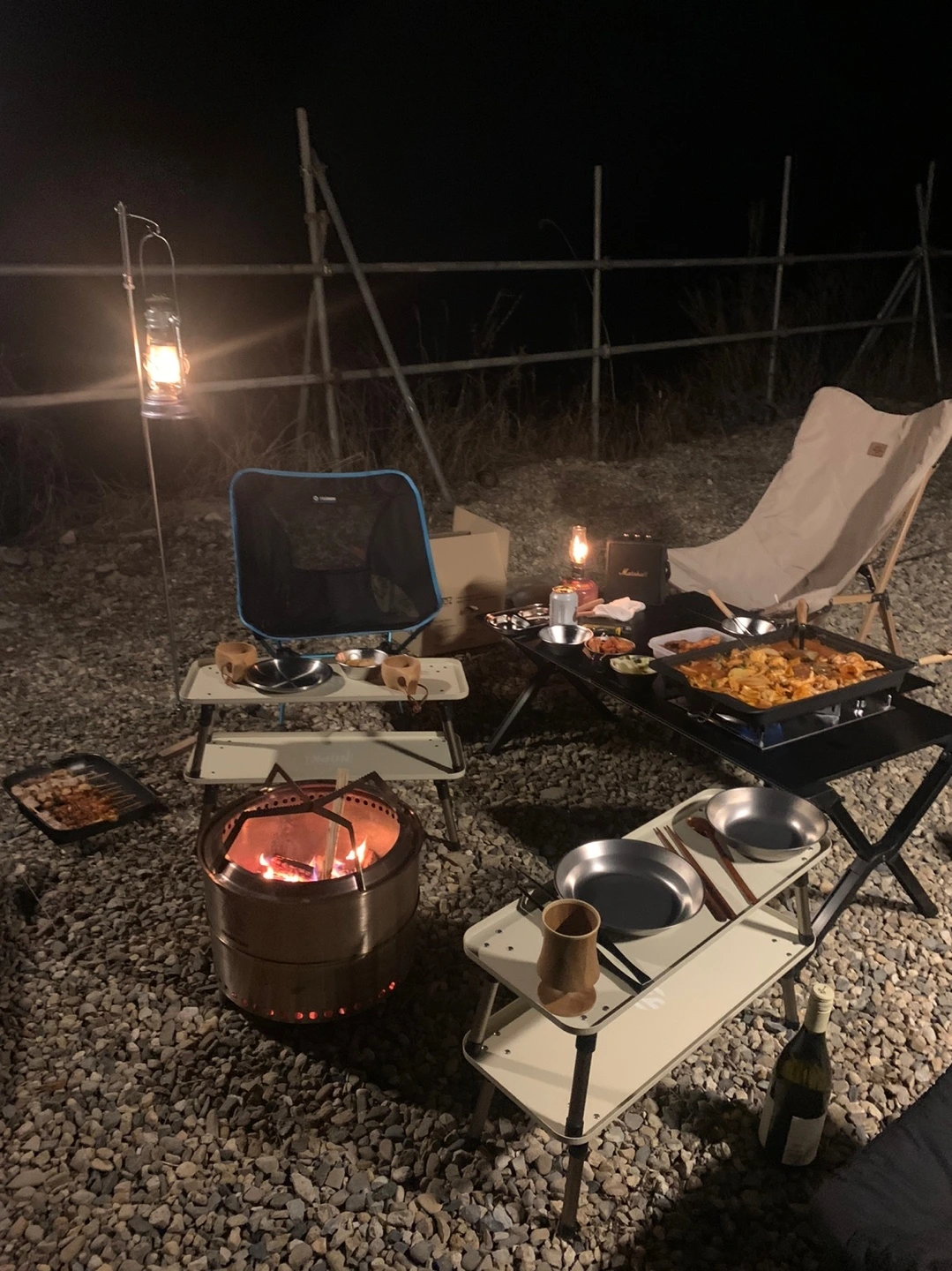이번엔 무거운 면텐트 대신 가벼운 쉘터형 텐트를 가져왔다. 가볍게 치고 철수하려는 계획이다. 쉘터 안에 야전침대를 양옆에 두고 가운데 테이블을 두어 의자 없이도 테이블을 사용하는 입식으로 꾸몄다. 그리고 가려지지 않는 창과 좁고 낮아 취침 용도로 사용할 수 없는 베스티블은 주방으로 꾸몄다. 요리를 할 때는 앉아서 하고, 주로 출입은 반대편 큰 문으로 할 계획이었다. 협소한 공간에 주방 짐을 놓으니 꽤 좁긴 하다.