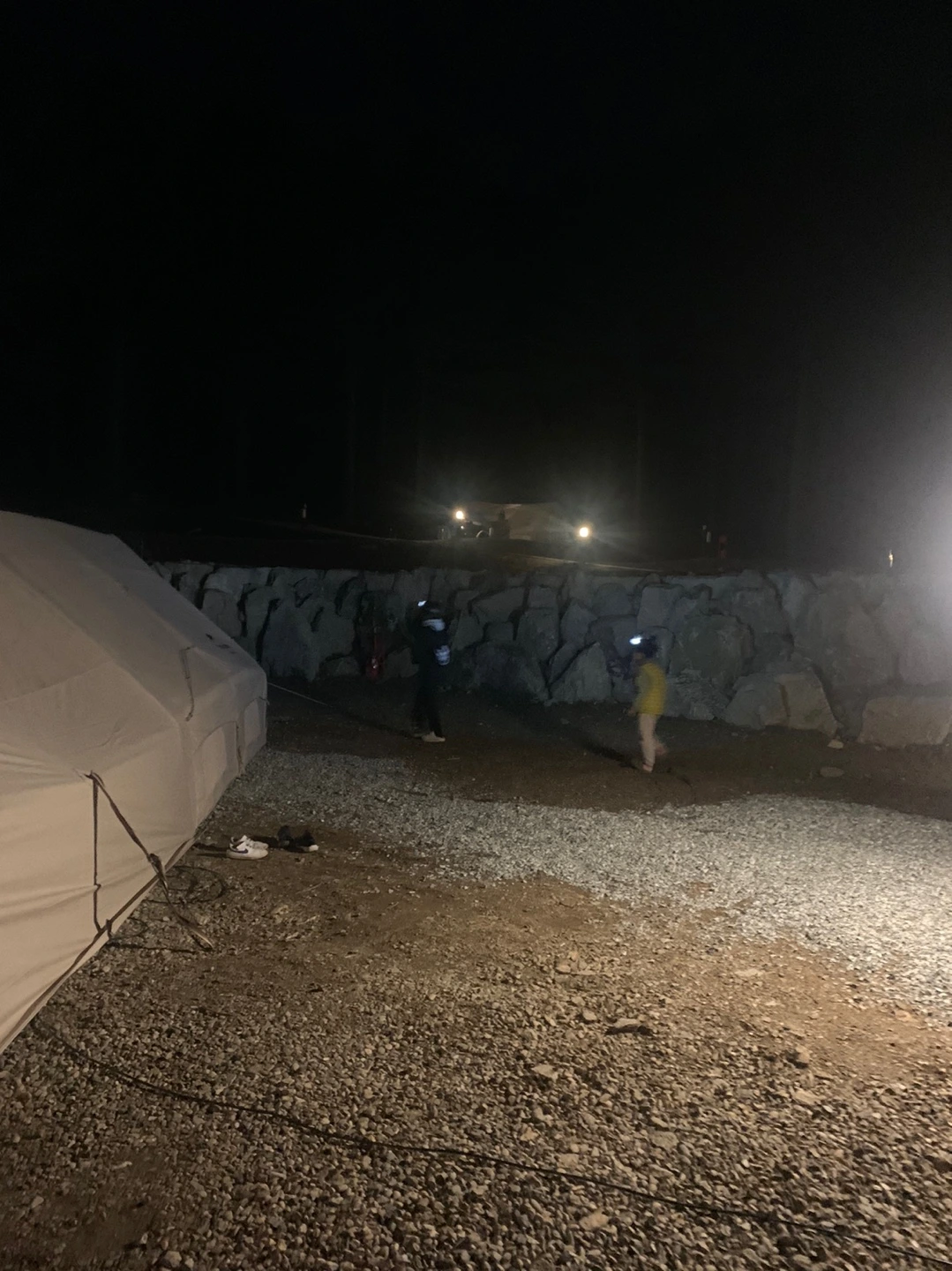 꿉꿉하고 집에 갈 걱정이 스멀스멀 올라오지만, 멋진 경치에 이것 또한 추억이고 날씨가 준 선물이라며 우리는 눈을 즐기기로 했다. 아이들은 양 텐트를 오가느라 신발과 양말이 마를 틈이 없고, 어른들은 갈아입히고 말려주고를 반복한다. 친구네 등유 난로 주변에 매달려있는 꼬질꼬질한 아이들 양말과 신발이 귀엽기도 하다.