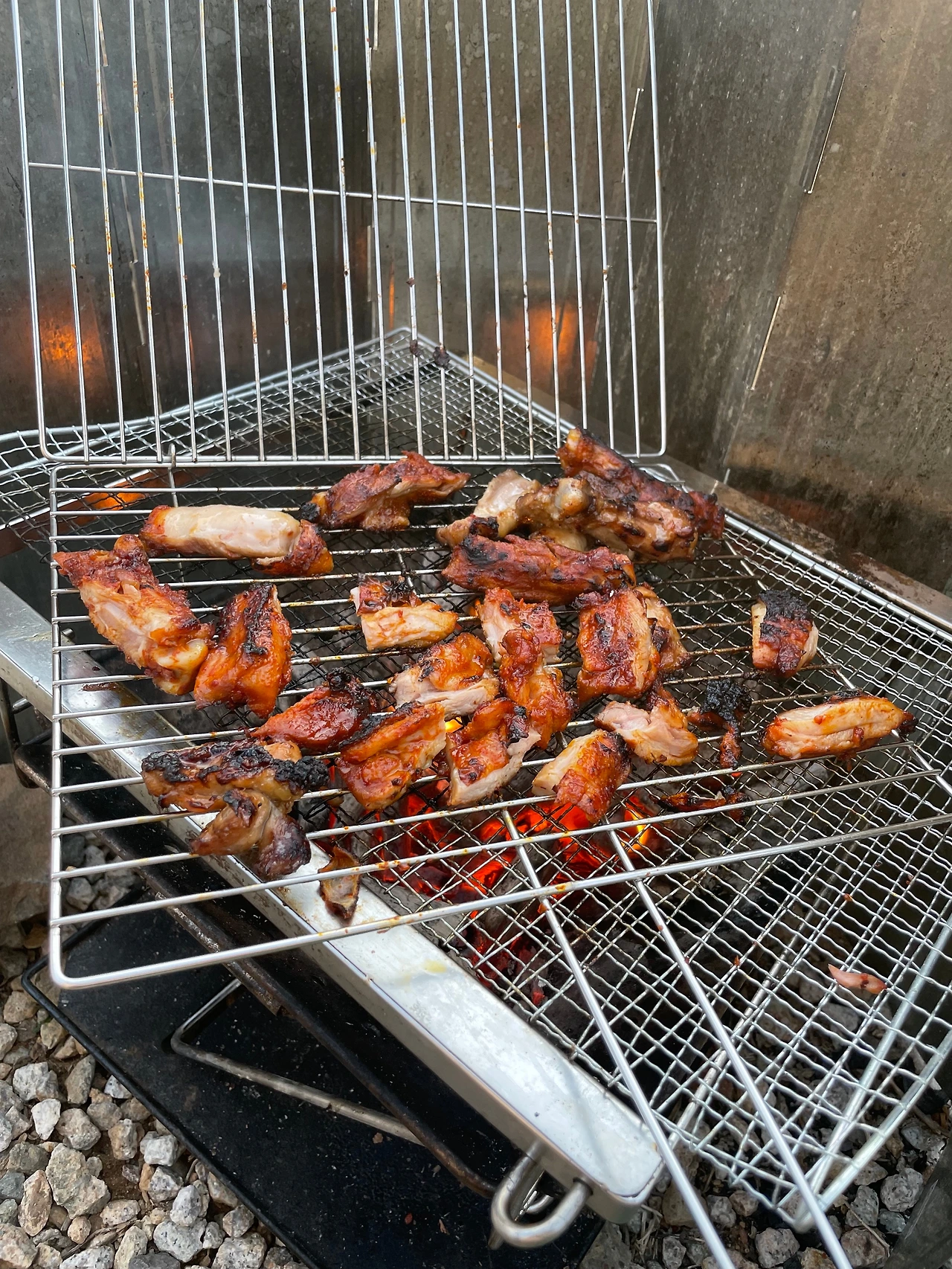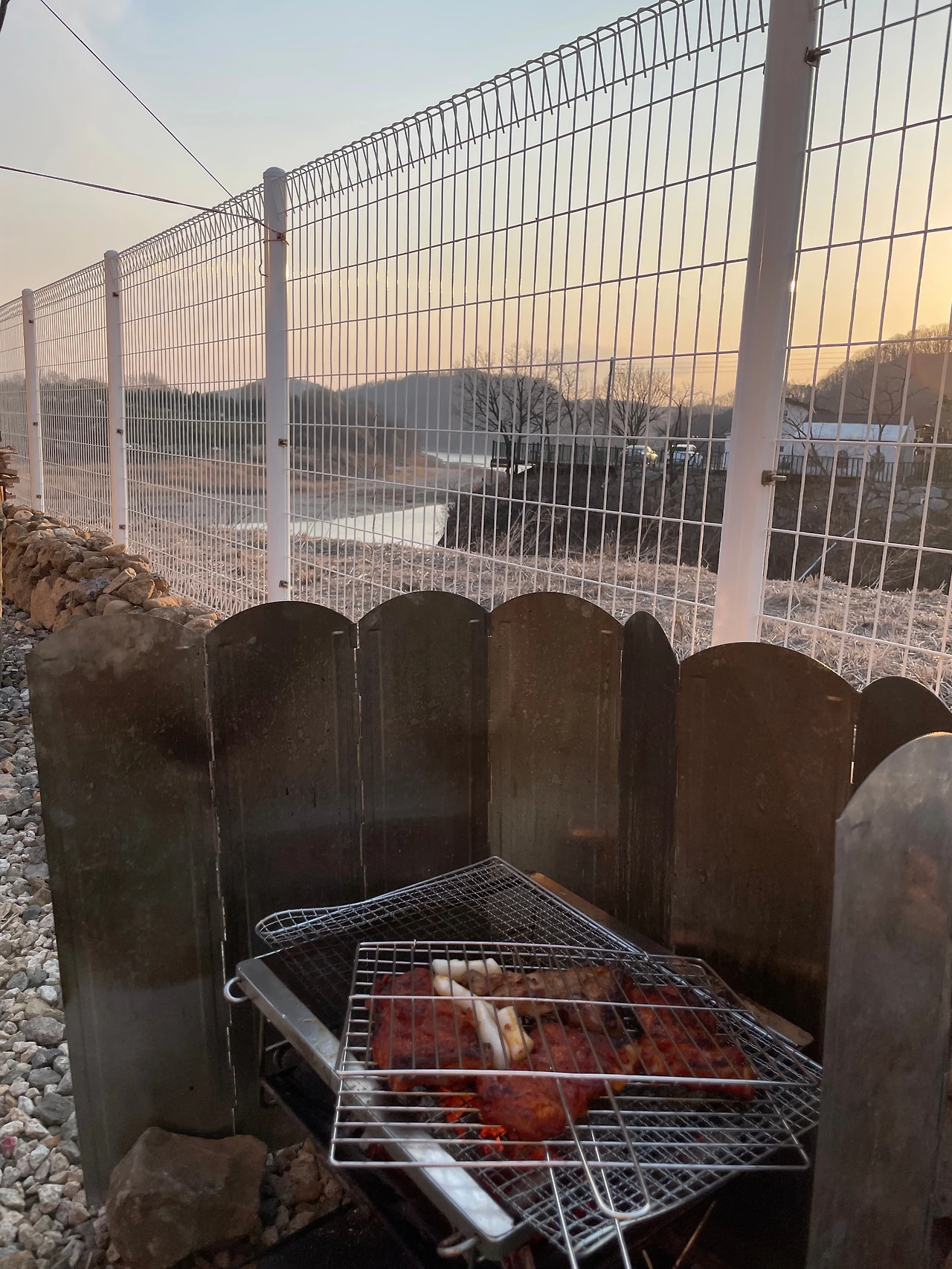 음식을 사 오니 너무 간단하다. 석쇠에 닭갈비를 구워 아이와 저녁을 먹었다. 친절한 캠장님 덕에 고기를 쉽게 구웠지만, 사실 장비를 못 빌렸으면 고생 꽤 했을 것 같다. 바람이 많이 불어 매쉬 화로대에서 고기를 굽는 건 불가능했을 것이다. 물 끓일 손바닥만 한 냄비 하나 가져갔는데 아마 거기에 익히지 않았을까?