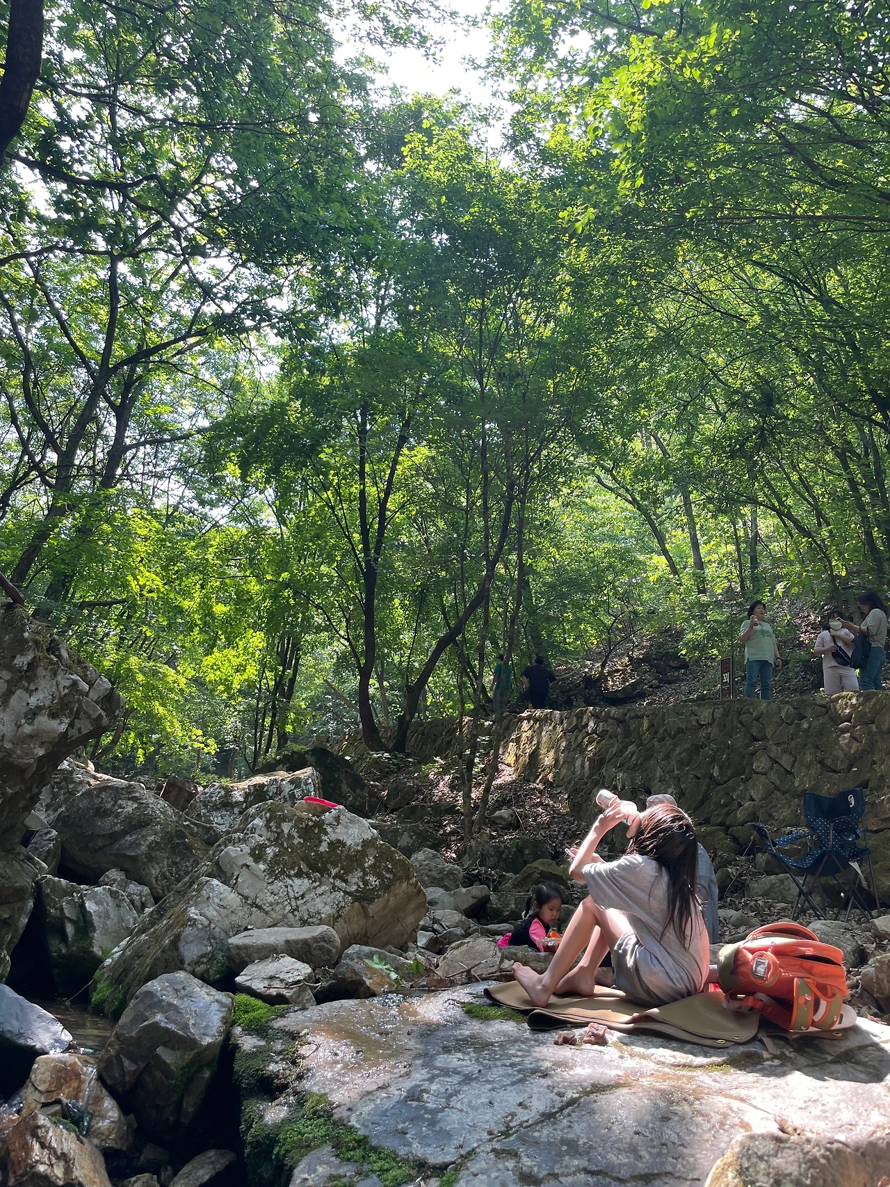 우리 아이가 독차지했던 해먹과 그나마 선풍기보다는 나은 에어컨을 친구 남편에게 선사하고 여자들과 아이들만 구곡폭포로 향했다. 거리도 가깝고 무엇보다 숲 속이라 덥지 않다. 오히려 선선한 바람이 분다. 가뭄이라 물이 많지는 않지만 어린아이들 발 담그고 놀만한 계곡도 있다. 우리 12살 새침한 언니는 벌레가 있다며 들어가지 않았지만 아직 어린 친구 아이들은 수영복까지 입고 와 신나게 놀았다. 다시 한번 캠핑장에서 탈출하기 참 잘했다. 여유롭게 시간 보내고 고기를 좀 사서 캠핑장에 돌아오니 더위가 많이 가셨다.