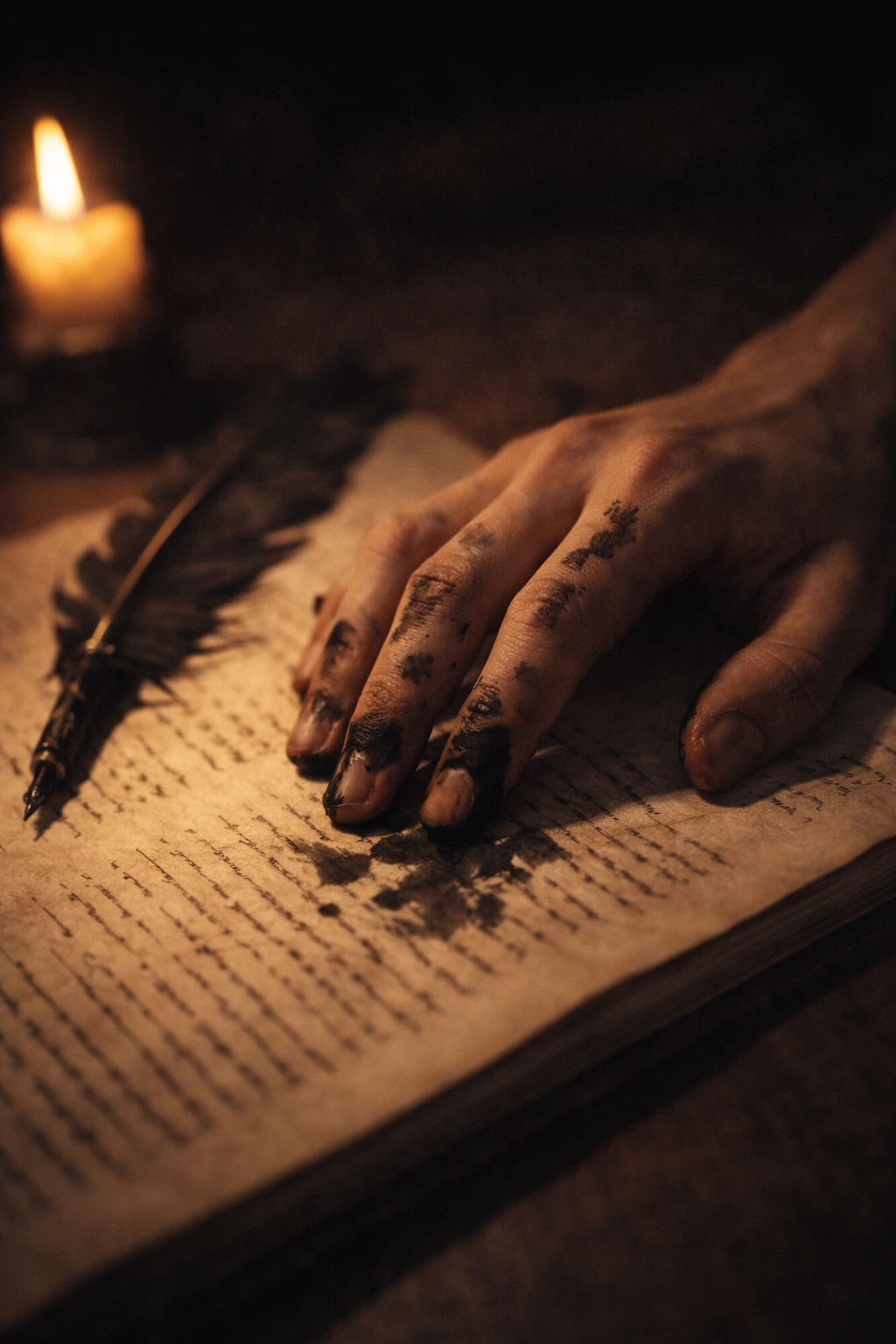 촛불이 흔들리며 그의 얼굴을 물들이고, 불꽃의 그림자가 이마를 스쳤다.