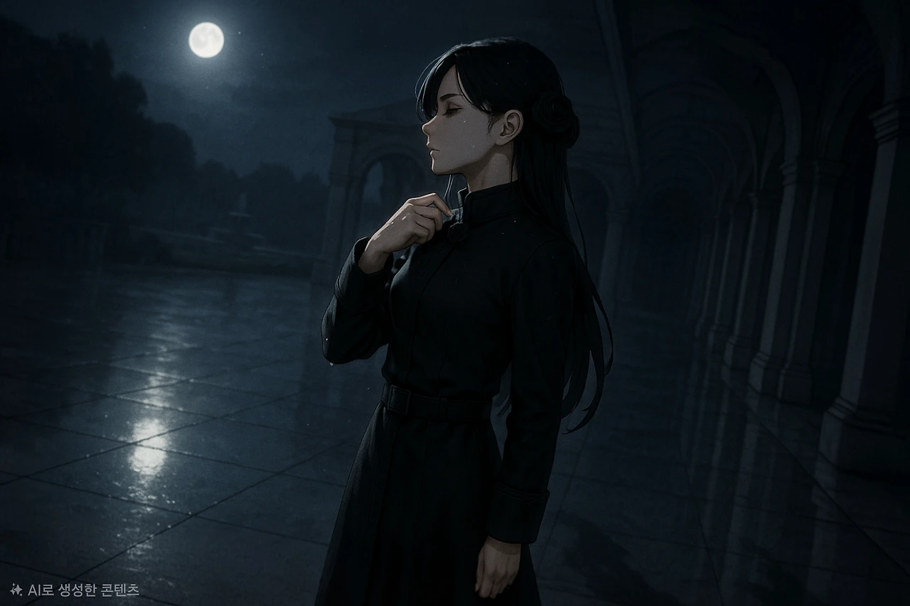 그녀는 젖은 옷깃을 손끝으로 가볍게 털어내며 다시 고개를 들었다.