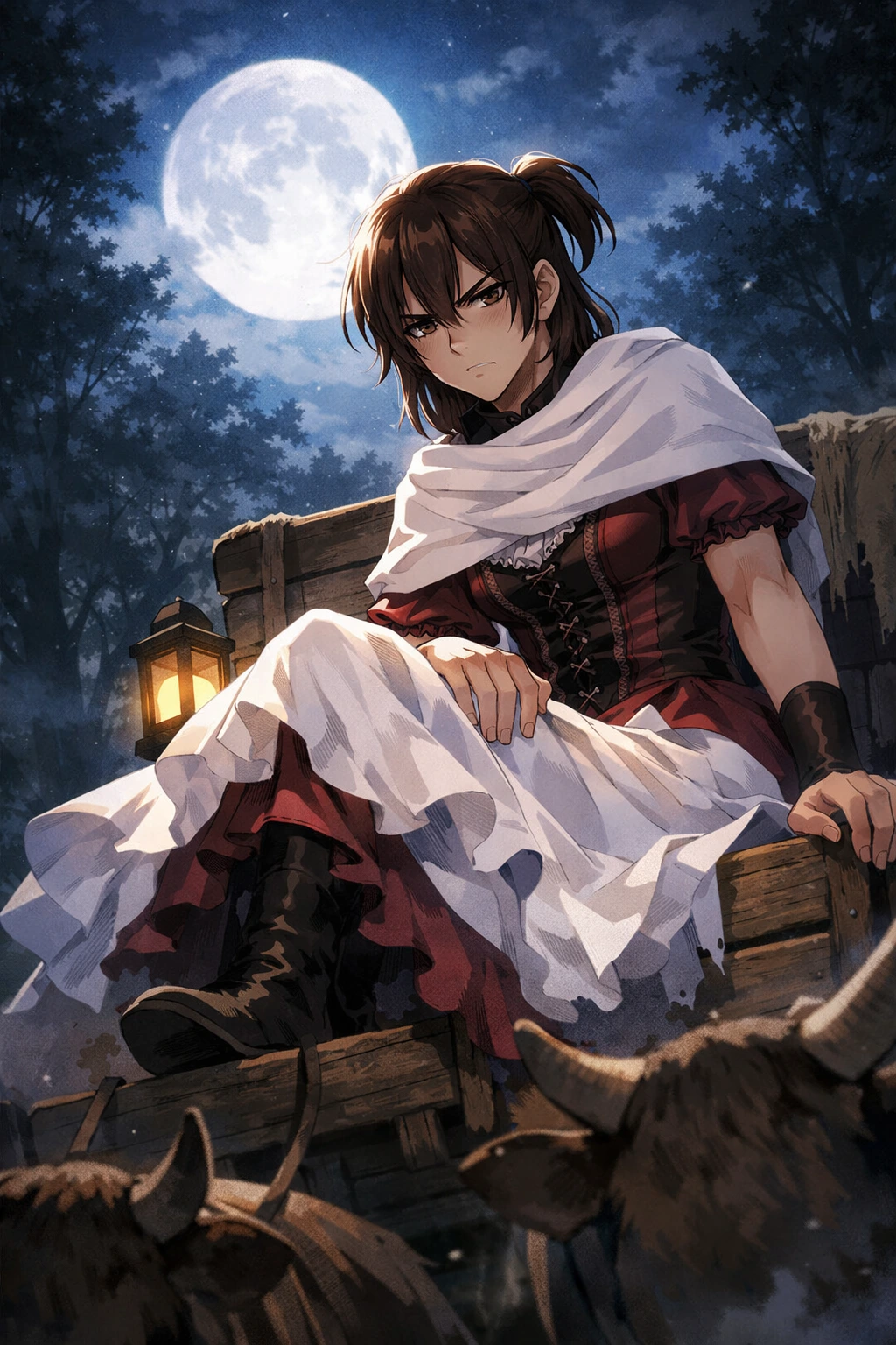 모닥불 곁에는 삐걱거리는 중형 수레 한 대와, 마을 근처를 배회하다 잡혀 온 누렁소 한 마리가 얌전히 앉아 되새김질하고 있었다.