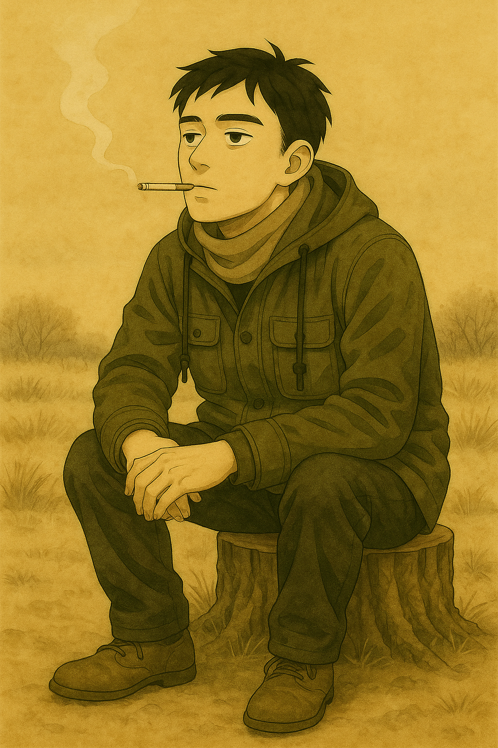 모닥불 옆에서 멀찌감치 떨어지는 남자.