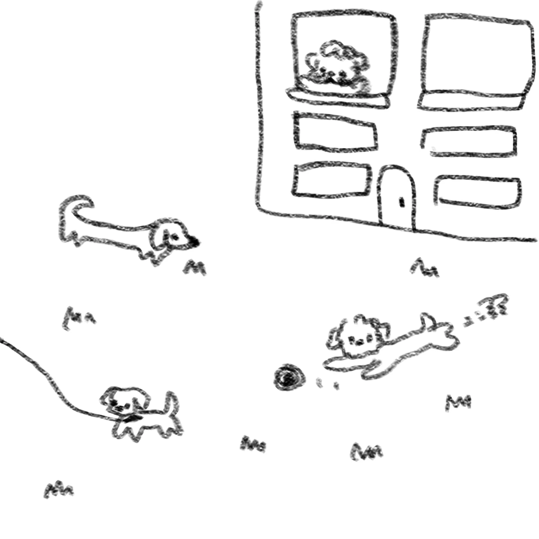 아래에서는 강아지들이 산책을 한다.