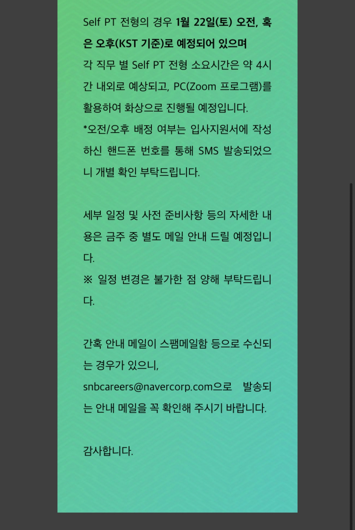 다음 편에서는 [초록창 신입 공채 뽀개기] 시리즈의 마지막 편인 1~2차 면접 후기를 다룰 예정이다.