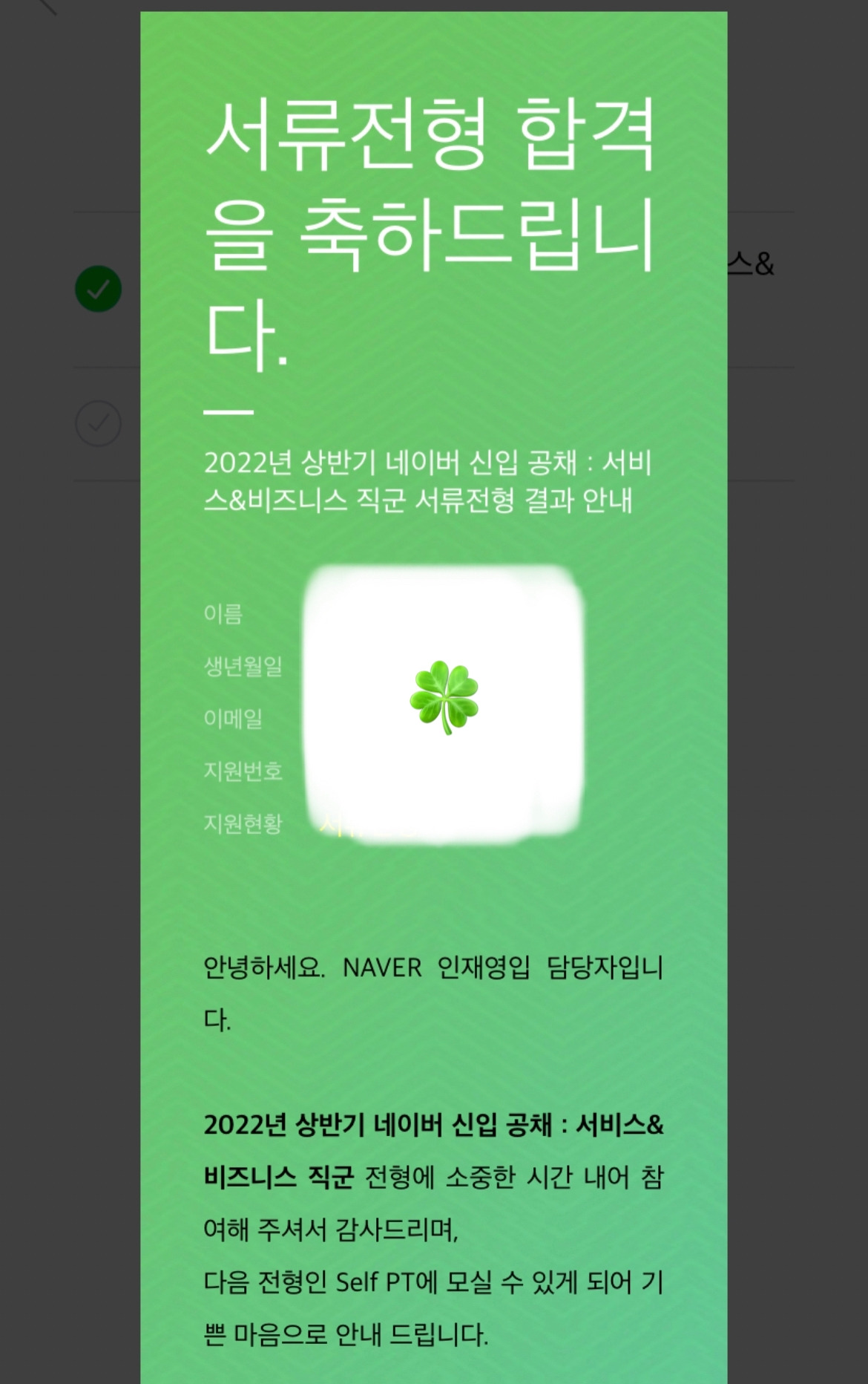 기업문화 적합도 검사까지 마친 후 떨리는 마음으로 서류 합격 결과를 기다리던 시기가 있다. 아무리 기다려도 연락이 오지 않자 점점 초조해지는 하루하루를 보냈고, 결과적으로 서류 전형 합격 소식은 한 달이 지나서야 겨우 나왔다(그만큼 지원자들의 자소서를 꼼꼼히 검토하는 네이버!).