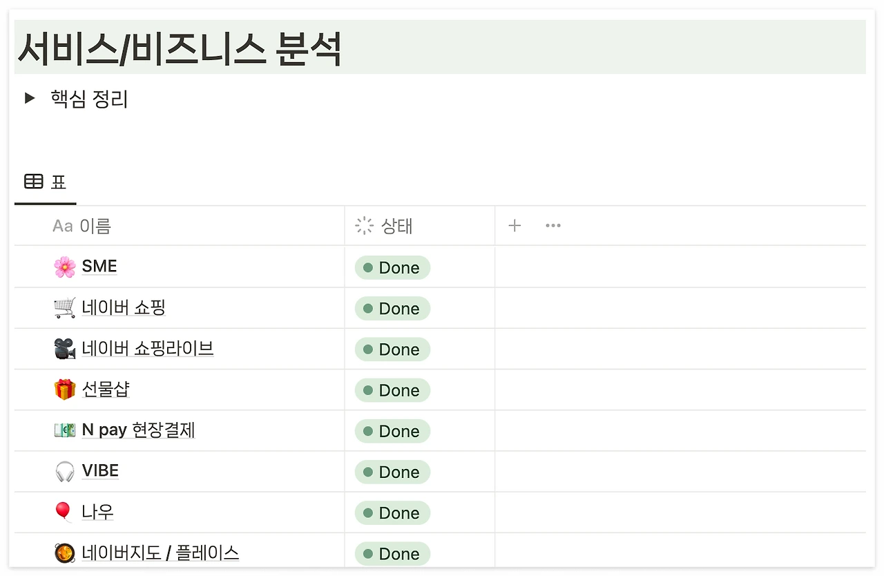 2023 신입 공채는 법인별 & 분야별로 모집한 것으로 알고 있지만, 밍꾸의 2022 S&B 신입 공채는 NAVER Corporation에서만 진행했으며 내부 조직(cic)에 따른 모집 구분도 없었다. 따라서 당시에는 공부 대상이 네이버 전체 서비스였으며 이는 아래 페이지에서 빠짐없이 체크했다.