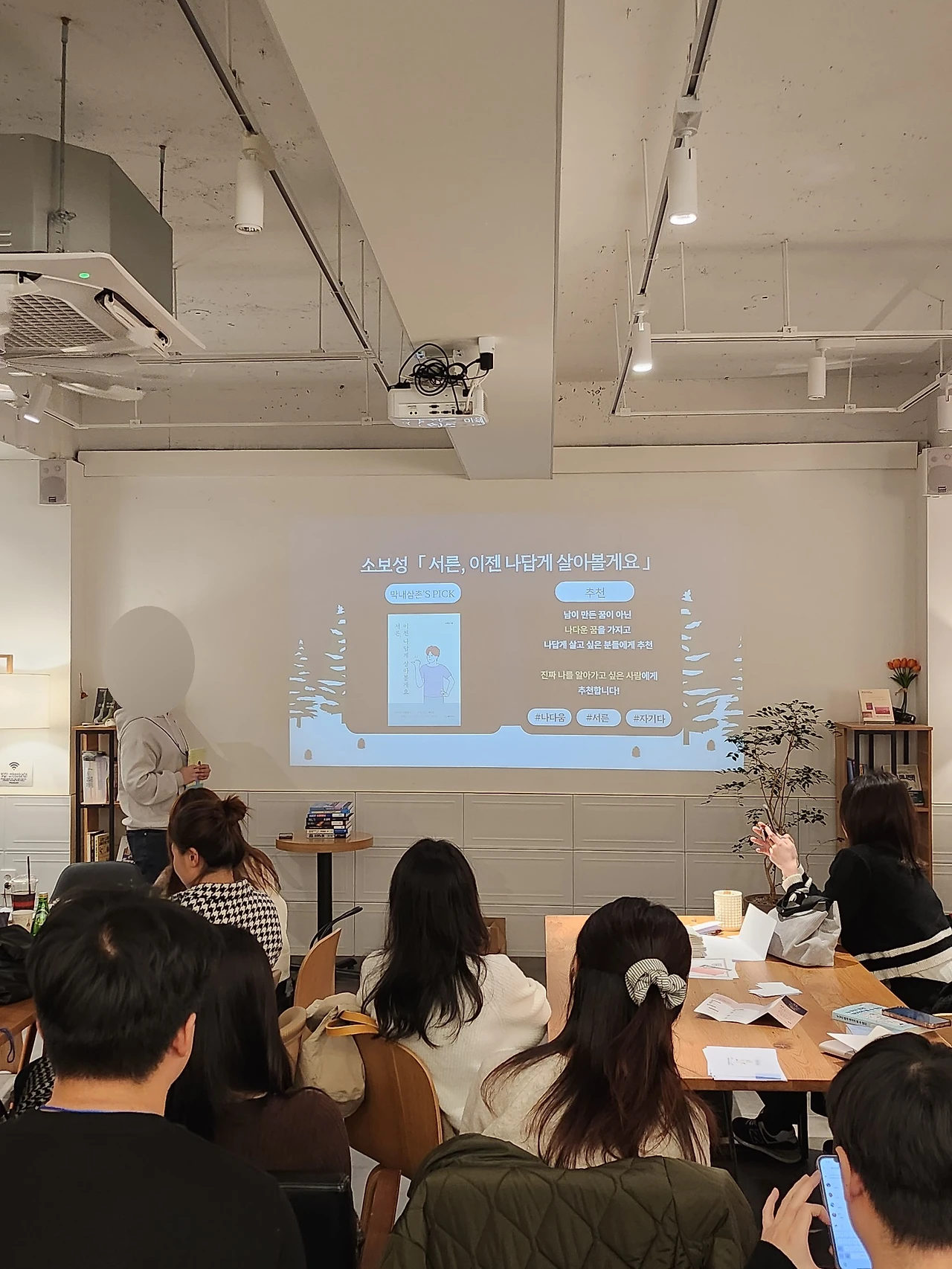 이번 모임에서 기억에 남는 일이 있다. 이번 독서파인다이닝은 3명의 메인 호스트와 6명의 스태프들로 구성되었다. 6명의 스태프 중에서 4명의 스태프는 4부 저자들에게서 온 선물 중 친필사인본 도서를 설명해 주는 역할을 맡았다. 각 한 권에서 두 권 정도를 맡아서 60명가량 인원들 앞에서 스피치를 해야 했다. 우리는 스태프들이 나중에 호스트 활동할 수 있도록 뜻깊은 기회를 주고 싶었다. 육십 명 앞에서 누군가에게 책을 소개하는 일이 그 어디 쉬운 일일까?