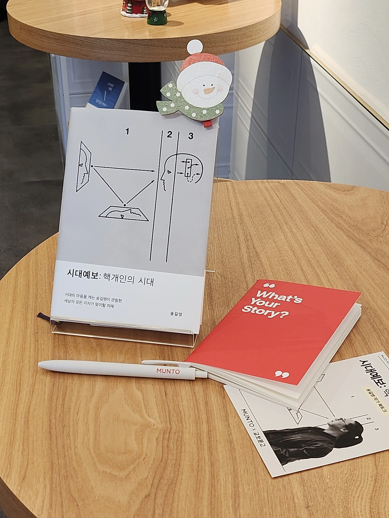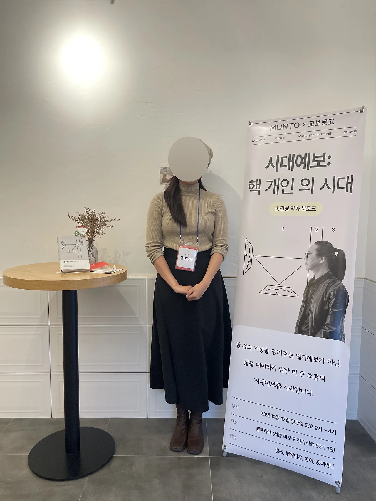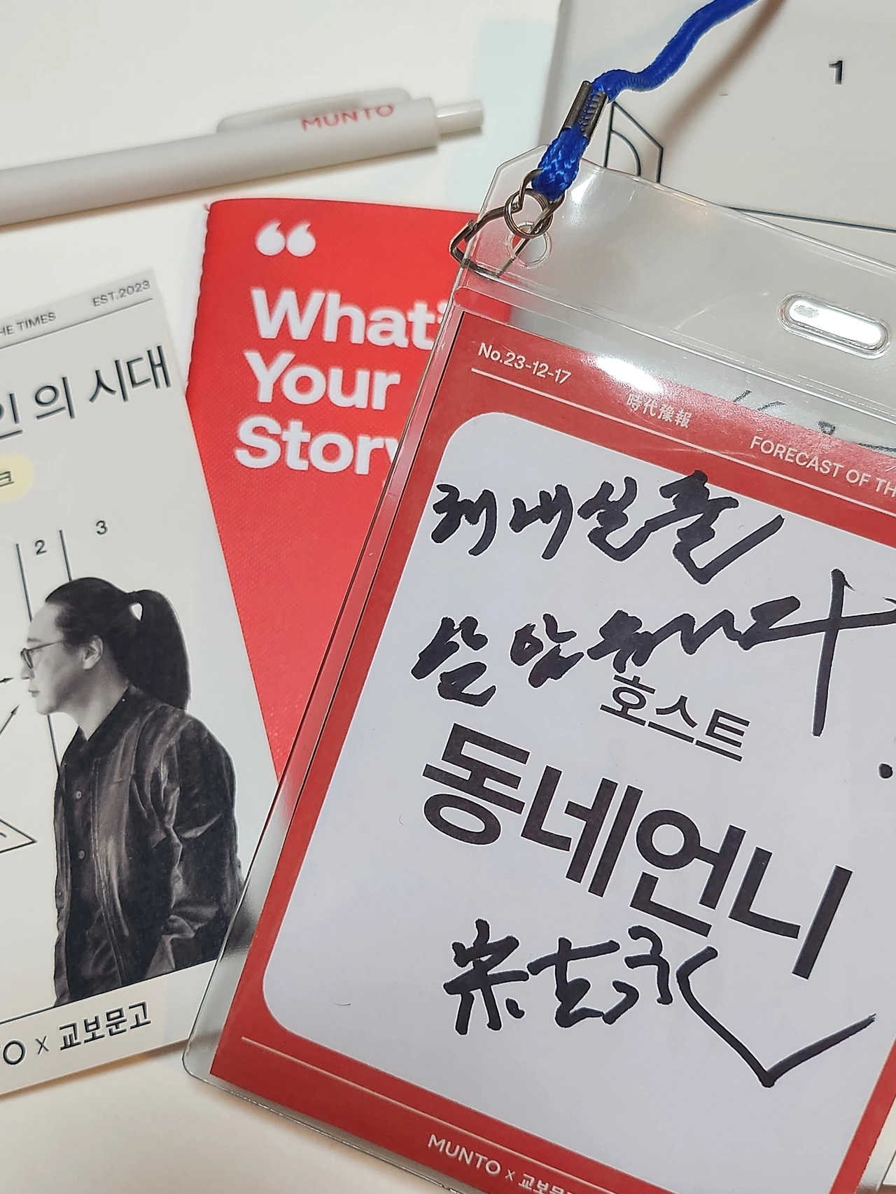 이름표 안에는 호스트 동네언니, 문토X교보문고 라는 단어가 모두 들어가 있었다. 여기에 송길영 작가님의 사인까지 받는다면? 이 행사를 준비하기 위해 마음을 썼던 그 시간을 응원받는 느낌이 들었다. 아래의 이야기를 들어보면 왜 이 문구가 떠올랐는지 조금 더 이해가 될 것이다.