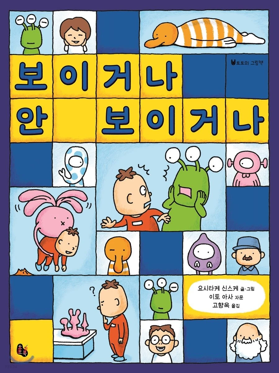 그중에 소개해주고 싶은 책은 요시타케 신스케의 <보이거나 안 보이거나>야. 지난번에도 이 작가의 책을 소개했는데, 또 나와버렸다. 아마 다음에 또 나올지도 몰라. 나와 준호가 엄청난 팬이거든! 이 책은 이토 아사의 <눈이 보이지 않는 사람은 세상을 어떻게 보는가>라는 책을 바탕으로 요시타케 신스케가 이야기를 생각하고 이토 아사와 의견을 나누면서 만들었대. 온갖 별을 여행하는 우주 비행사가 주인공인데 눈이 뒤에도 있어서 앞 뒤를 동시에 볼 수 있는 사람들이 사는 별에 도착하면서 책이 시작돼.