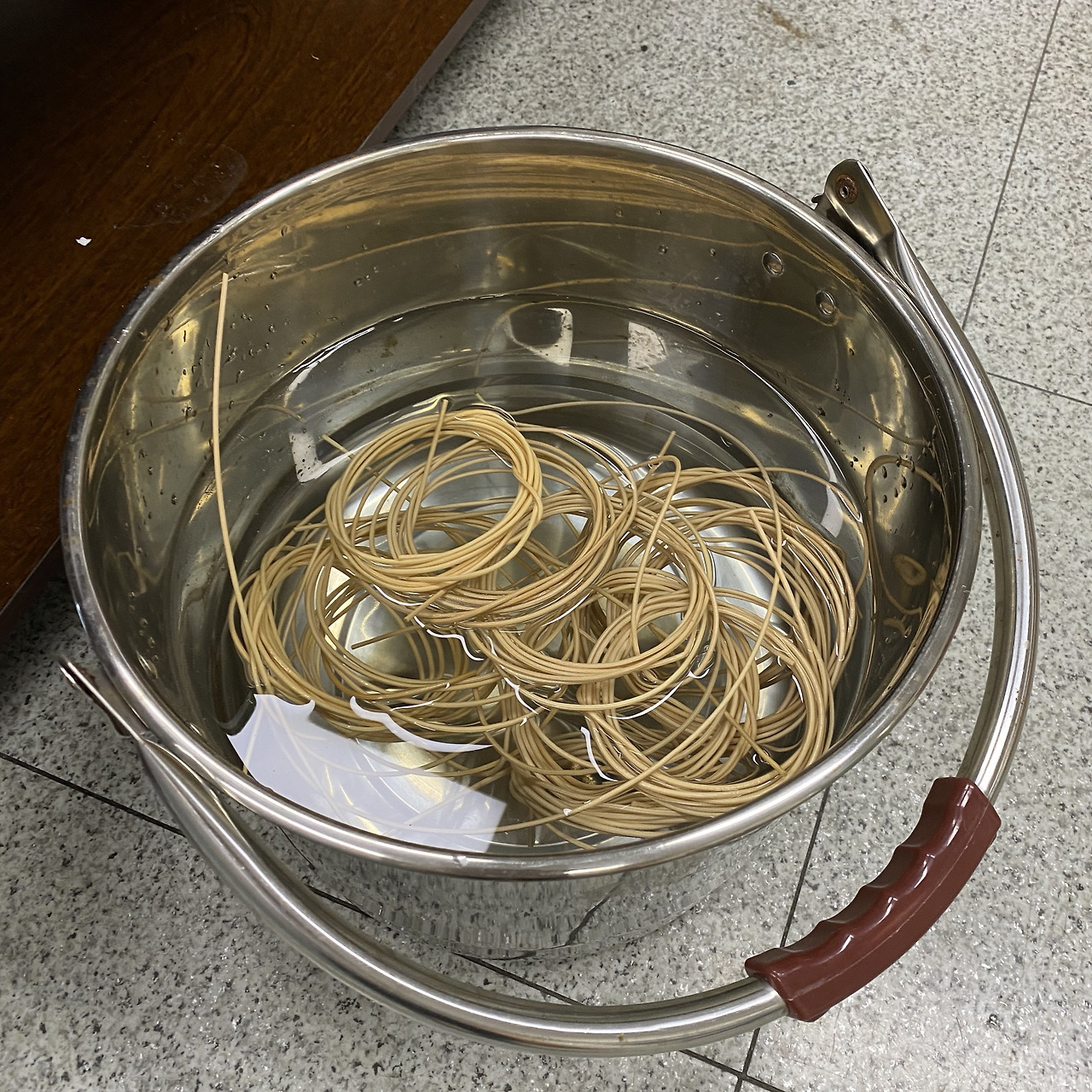 주문한 소품 바구니 키트가 도착한 날, 나는 곧바로 라탄 공예를 나의 새로운 취미로 삼기로 했다. 등나무 환심을 적셔서 말랑말랑하게 한 후에 만들어야 하기 때문에 되는 대로 커다란 냄비(?)를 찾아 환심을 가득 담갔다. 취미 키트라 동영상이 제공되었고, 동영상을 보며 한 땀 한 땀 바구니를 만들어 나갔다.