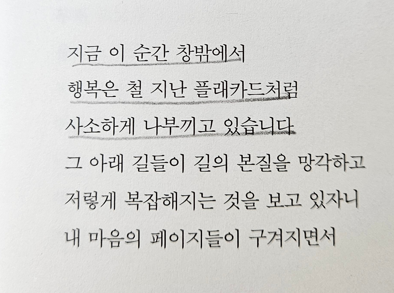 현대 시와 정통 시의 중간쯤에 선 시집 같았다. 붙잡고 싶은 말들이 떠다녔고, 슬프면서도 아름다웠다. 나는 어쩐지 정통 시집을 읽는다는 느낌과 정서에 푹 빠져서 읽었다. 참았던 눈물을 쏟게 하는 어떤 지점이 이 시집에는 있다.