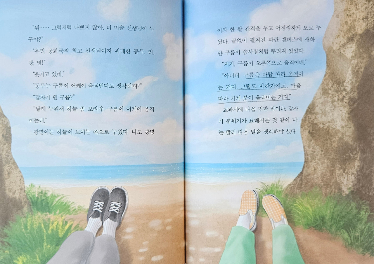 달달 볶는 미술 선생님과는 그림을 그리지 않겠다고 선언했지만, 북한의 아름다운 해변에서 누가 시키지 않아도 그림을 그리고 있는 초록이가 사랑스러웠다. 자연스럽게 그려진 장마당 풍경과 동그란 오징어에 야채를 넣어 익힌 낙지 순대도 생소했다. 교과서에 나올 법한 말도 척척 하는 리광명도 대단하고 해변과 동굴 등 아름다운 풍경이야기와 그림도 좋았다. 북한의 리광명과 남한의 초록이가 스스럼없이 가까워지고 마음을 나누는 모습이 정말 아름다웠다. 분단 상황이라 가 볼 수 없는 우리의 북한 땅을 책으로나마 가 볼 수 있어서 정말 좋았다.