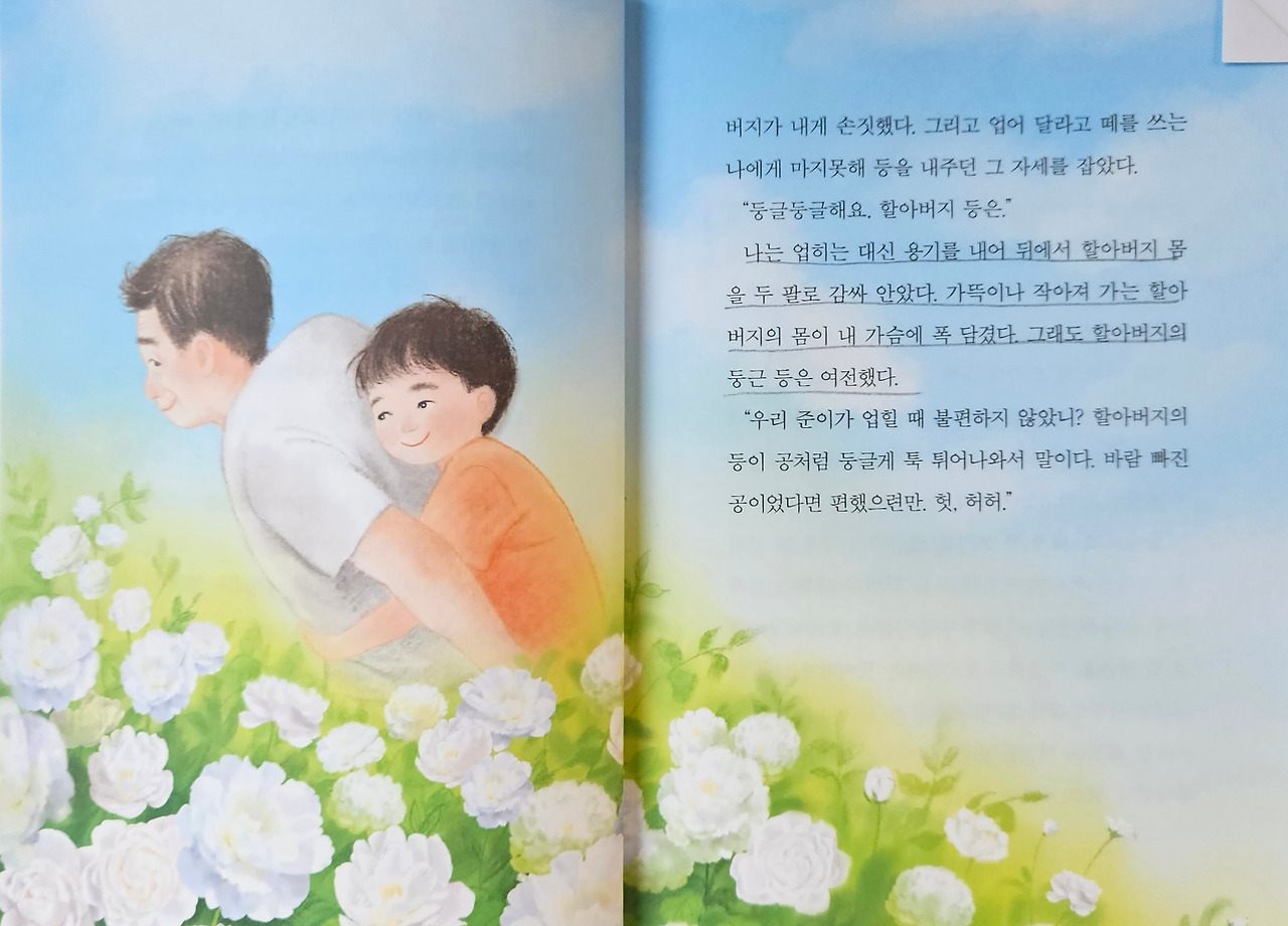 준이는 할아버지 등에 업혀 자랐다. 할아버지는 준이가 자라면서 자전거를 배워 자전거에 태워주셨다. 학교에서 시를 배우는 준이는 할아버지와 제법 말이 통한다. 할아버지의 등이 동글동글한 것은 “따뜻하고 포근하다는 뜻, 할아버지를 사랑한다는 말”이라고 말한다.