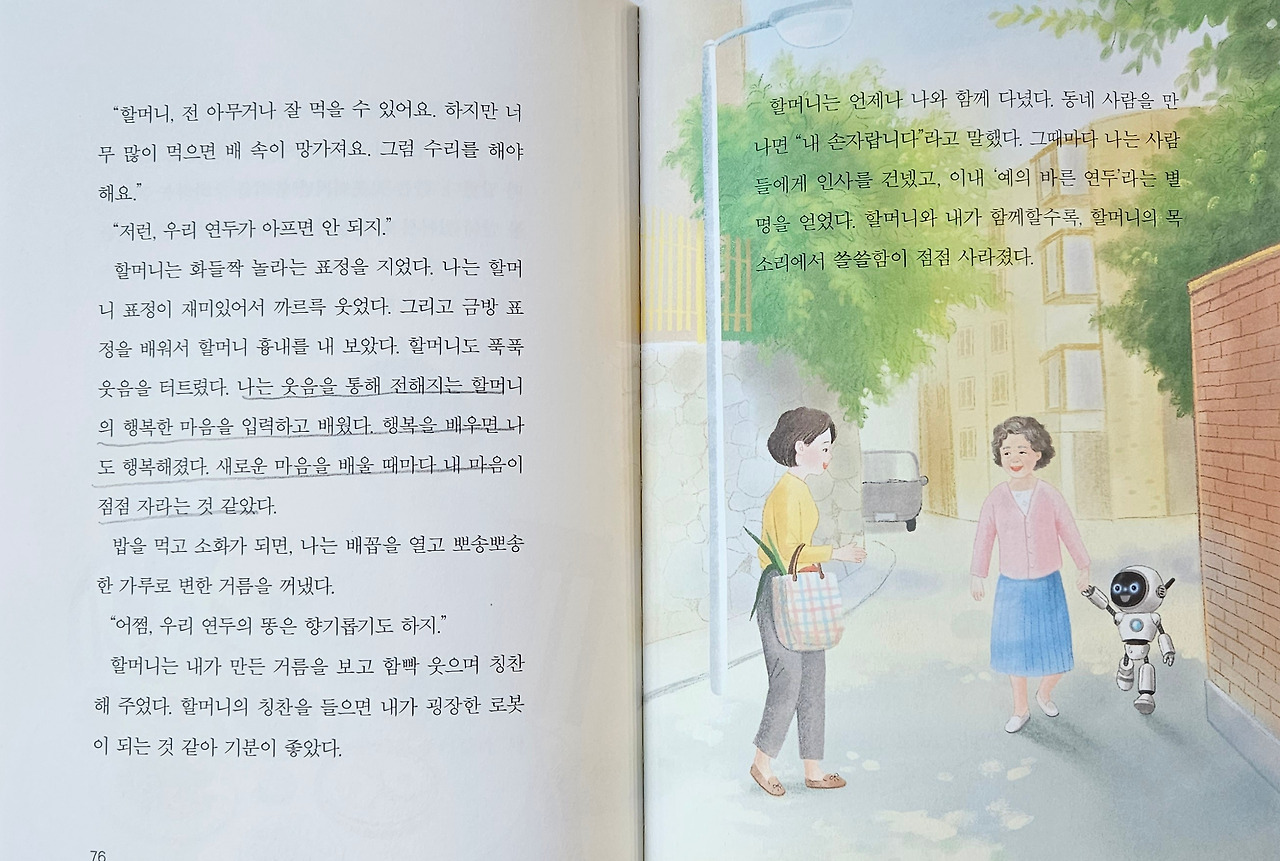 로봇이 손자의 역할을 대신한다. 핵가족 시대에 독거노인을 위한 보호 로봇인가 했는데 오히려 할머니가 돌봐 주고 싶은 손자의 역할이 로봇의 임무였다. 로봇은 할머니의 행복한 마음을 입력하여 스스로 배운다. 감정을 학습하고 이별을 예감하고, 사랑을 느끼는 등의 최신 로봇이라는 설정이 재미있었다. 미래에 변해갈 모습을 동화로 미리 만난 것 같아서 흥미로웠다.