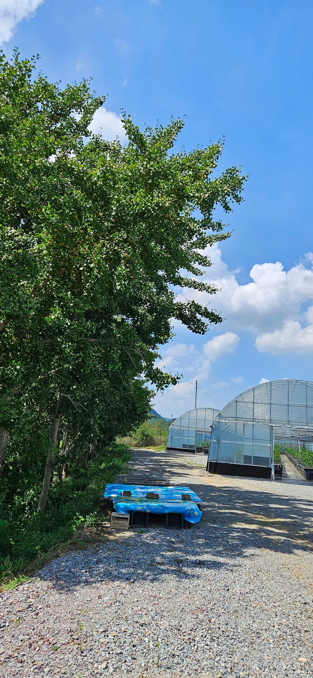 은행나무 이파리가 굵어지고 초록이 무성해졌다. 그 아래 평상을 펴고 쉼터를 만들었다. 하우스 안에 마련된 쉼터는 봄까지는 추위를 막아줘서 쉴 수 있었다.
