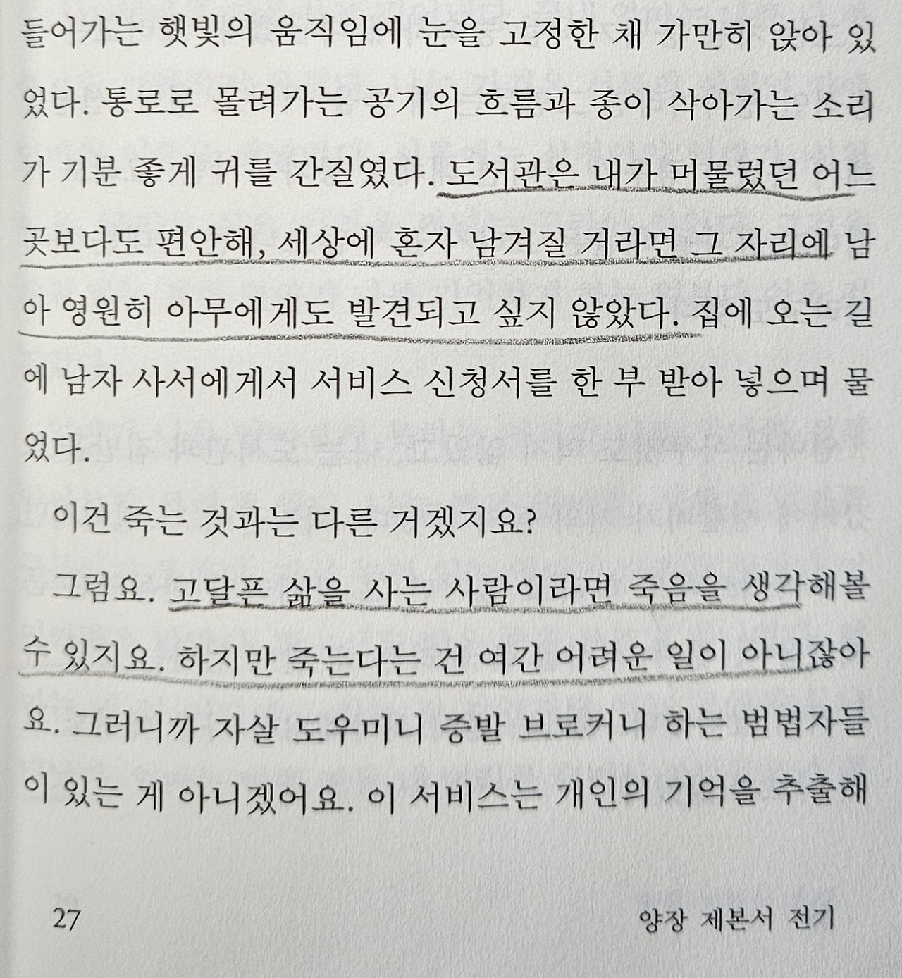 이 서비스는 개인의 기록을 추출하여 양장 제본서로 남긴다고 했다. 몸은 사라지지만 정신은 제본된 기억 속에 머물게 되는 방식이라고 설명해 준다. 엄마가 자기를 알아보지 못하는 것처럼 자기도 엄마를 점점 알아보지 못하게 되었다고 한다. 벽이랑 장판 등 한 공간에 있으면서도 엄마를 의식하지 못했고, 엄마가 아닌 사물로 인식하게 되었다. 엄마는 늘 함께 있기도 했고, 없기도 했으며 결국은 집이 되었다고 생각하는 주인공의 심리가 이해되기도 했다.