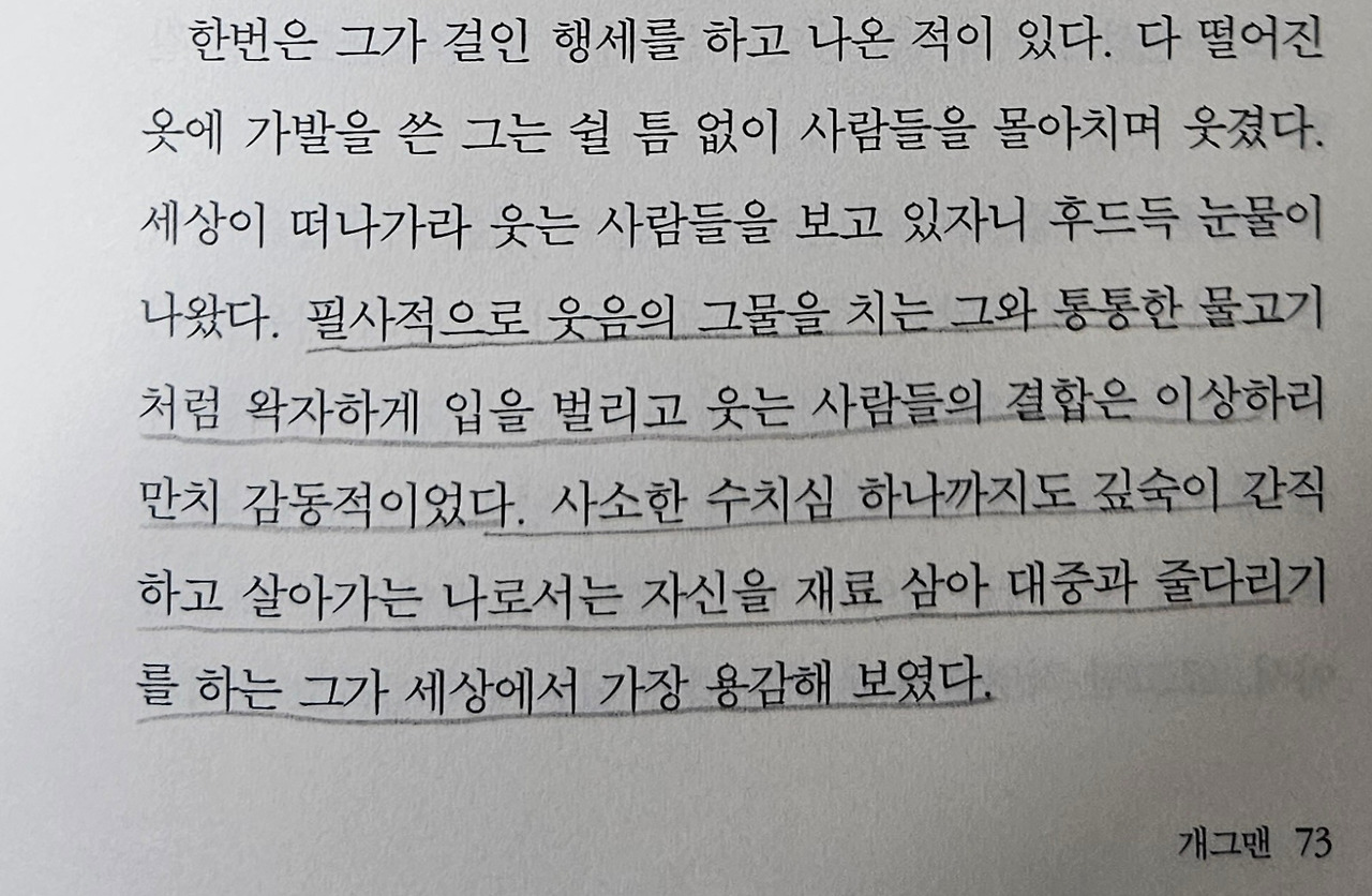 “흐르는지도 몰랐던 시간이 갑자기 벽에서 튀어나와 거울을 내밀기 시작했다.”라고 노년도 아닌 중년이 돼가는 외로움을 표현했다. 무명의 개그맨이 전성기의 개그맨을 흉내 내기 시작하고 ‘그때 개그맨의 엽서가 도착했다’라고 쓰여 있다.
