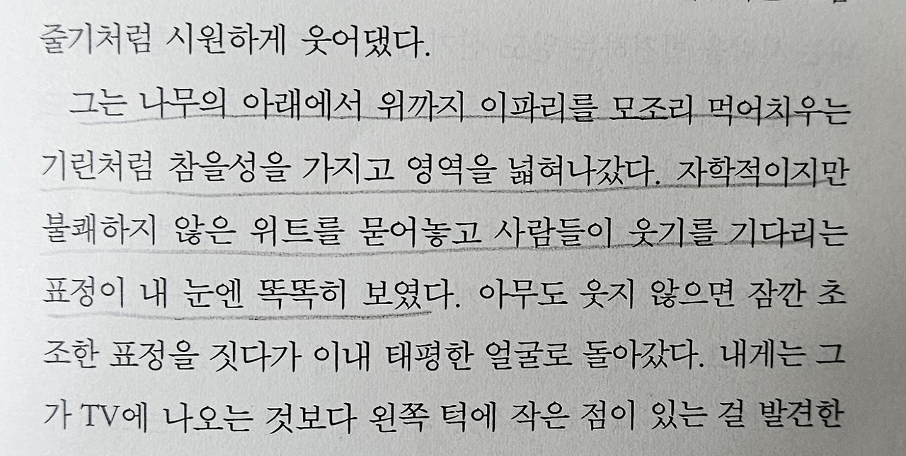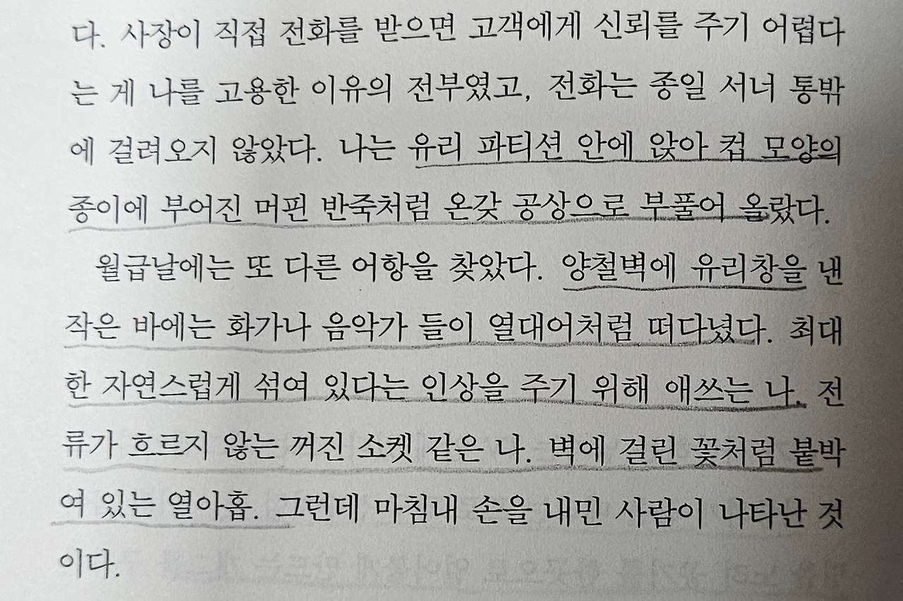 “최대한 자연스럽게 섞여 있다는 인상을 주기 위해 애쓰는 나, 전류가 흐르지 않는 꺼진 소켓 같은 나, 벽에 걸린 꽃처럼 붙박여 있는 열아홉” 주인공을 표현하는 문장이다. 비유와 상징 잘 쓴다는 설명을 들었는데 작가의 상징적 표현이 자주 등장했다.
