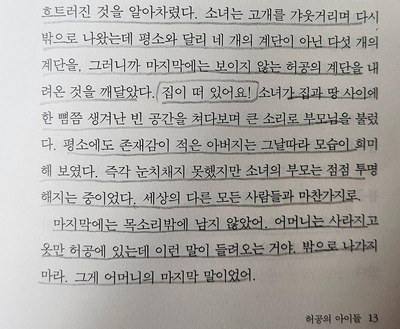 상상하기 어려운 재난 상황이다. 집이 떠오르다니, 사람들이 투명해지면서 사라지다니, 소멸과 성장이 공존하는 공간이다. 이유도 없이, 설명도 없이 무작정 주어진 운명 앞에서 불가항력이다. 재난 이후의 삶을 대하는 아이들의 시선이 너무 담담했다.