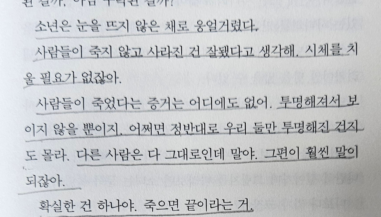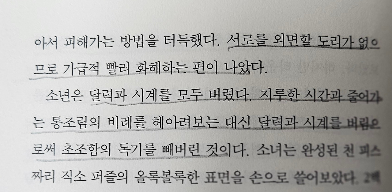 독자의 입장에서도 제발 그랬으면 좋겠다는 생각이 들었다. 반대로 두 사람만 투명해져 있는 거라면 좋겠다. 땅이 무너지면서 소년과 소녀는 소녀의 집에 고립된다. 두 사람은 자주 다퉜고, 도리없이 빨리 화해했다. 소년은 달력과 시계를 모두 버렸다.