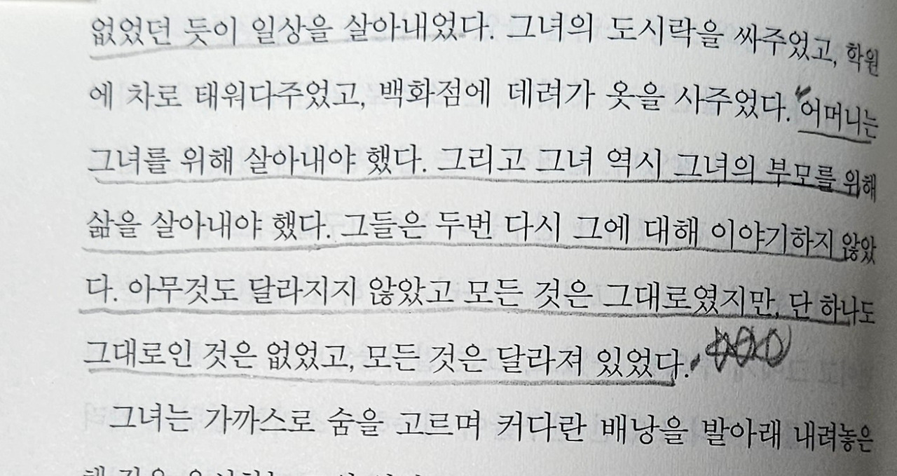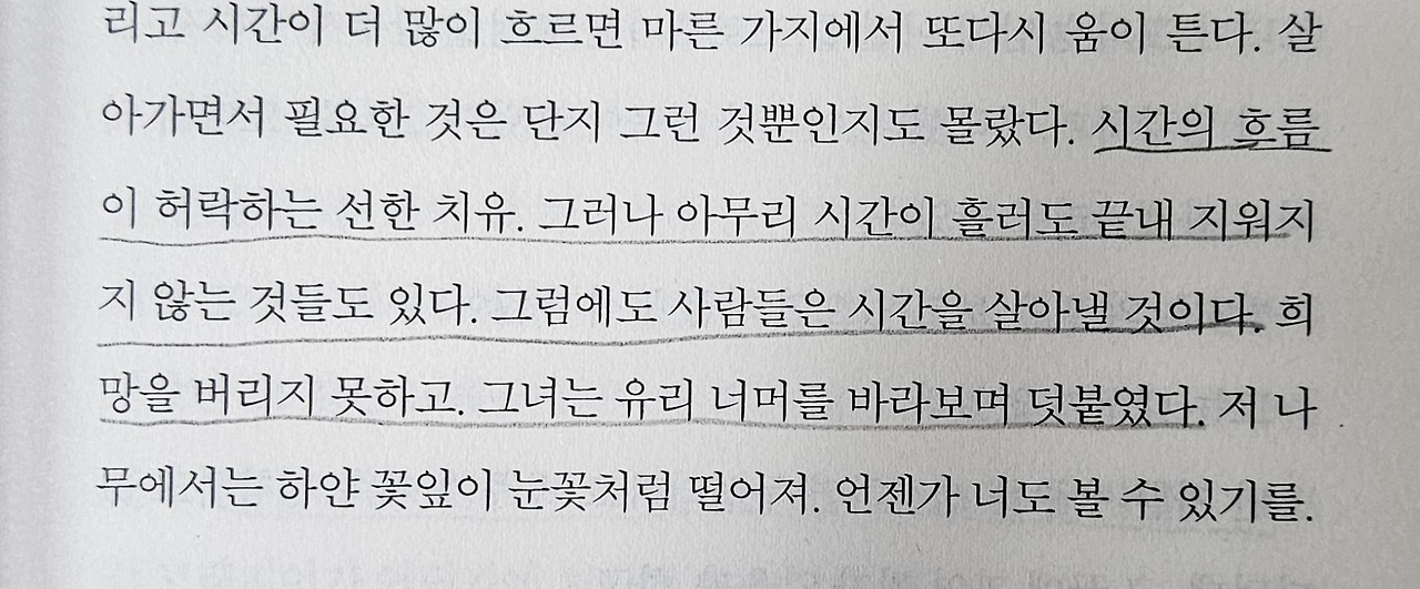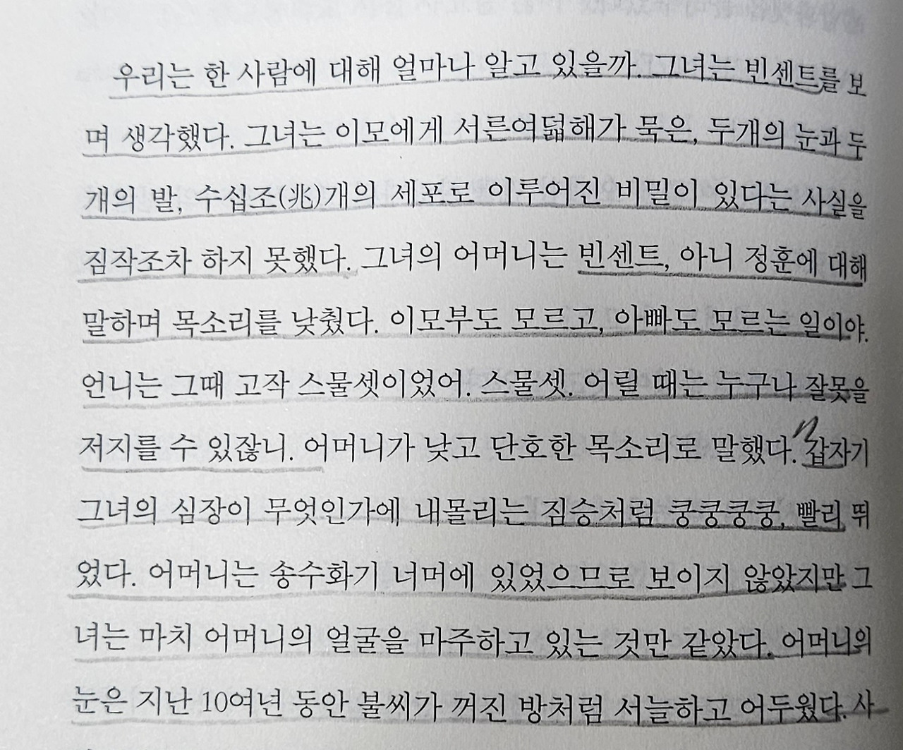 아름다운 문장들 사이에서 슬픈 서사가 흘렀다. 내용이 슬프면서도 문장들이 좋아서 감탄하는 사이 이야기가 끝이 났다.
