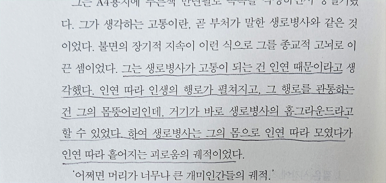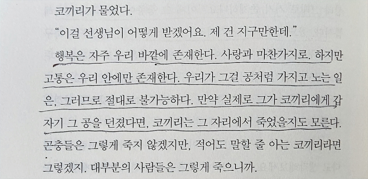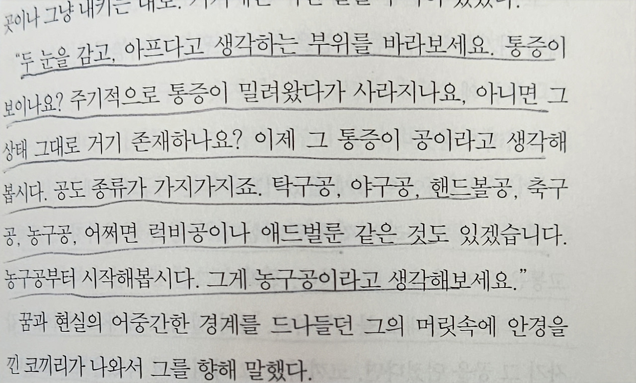 마지막 문장이다. '그것'은 무엇이었을까? 죽음? 저승사자? 고통? 누군가가 던져 보낸 고통으로 만든 공은 아니었을까? 고통의 원인을 밝히는데 집중하지 않고 그것을 받아들이고 지나가는 데 집중한다는 점이 매우 인상 깊었다.