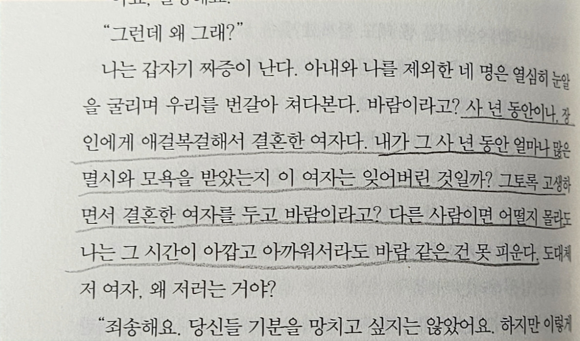 대화가 많이 나오면서 서사가 빠르게 흘러가고, 주인공들의 대사를 통해 심리나 상황을 표현하고 있어서 수월하게 읽혔다. 짧은 모임 시간이지만, 회상과 여러 주인공의 입장과 대화들로 진행되는 서사가 읽기 쉽게 구성되었다.
