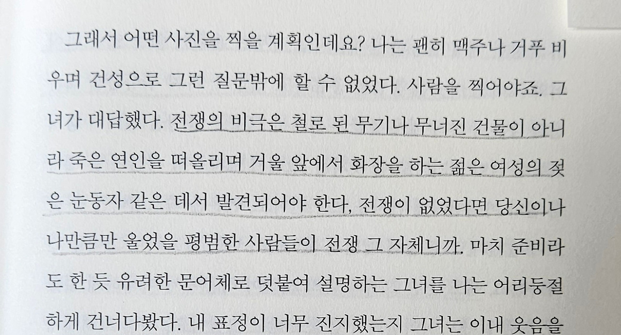 전쟁에 대해서 전쟁이 개인에게 미치는 영향에 대한 이야기를 나누고, 그런 위험지역에서 사진을 찍는 권은에 대해서 계속 마음에 축적되는 무언가를 생각하게 한다. 권은이 존경한다는 ‘헬게 한센’ 감독의 팔레스타인을 공격했던 사건과 구호품 트럭의 피격이라는 전례 없는 사고를 다룬 다큐멘터리를 관람한다.