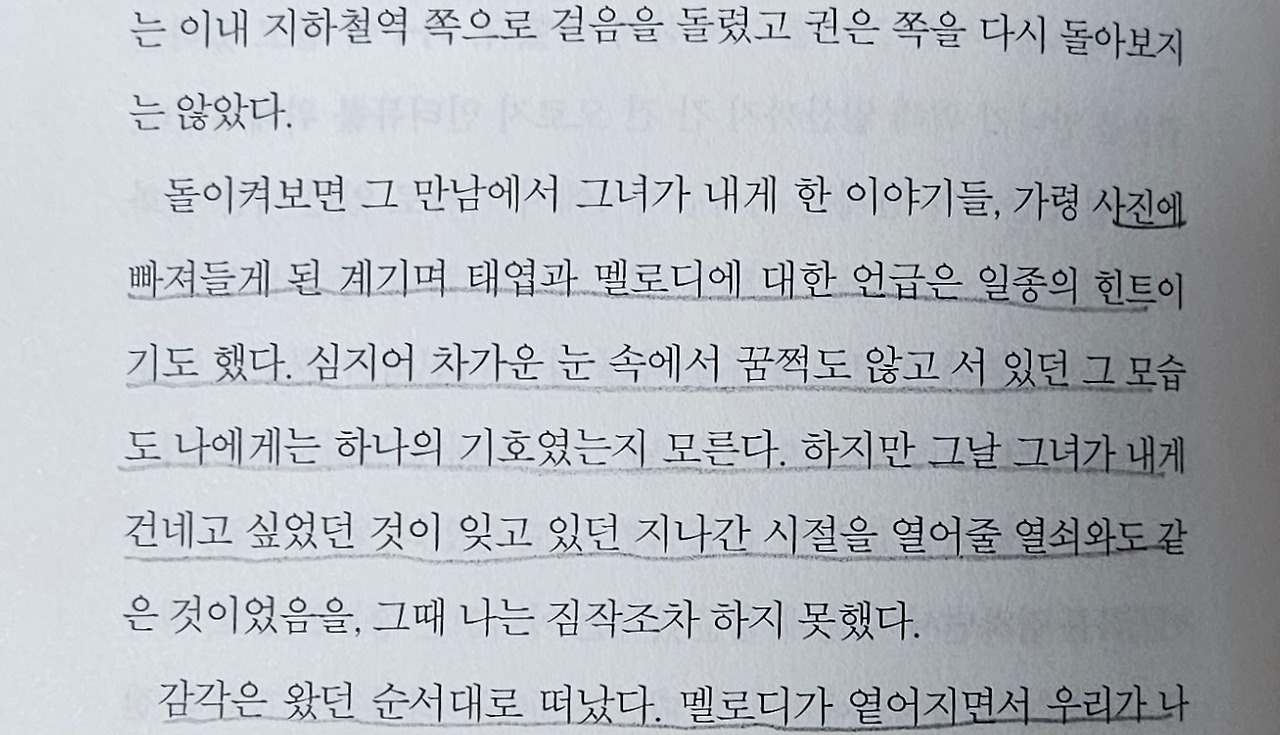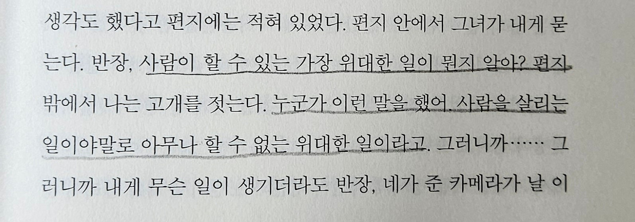 (그 카메라를 준 사람이 주인공이라는 것이 밝혀져 놀라웠다. 주인공이 권은의 빛이었다는 것이 더 놀라웠다. 권은은 친구가 준 카메라의 셔터를 누르는 순간 숨어 있던 빛들이 쏟아져 나와 피사체를 감싼다는 표현이 그럴듯하고 멋진 문장이라는 생각이 들었다. 빛은 죽음을 향한 사람들을 살려내는 위대한 일을 해내는 사람들의 상징이기도 한다. 우리는 빛이 될 수 있을까?)