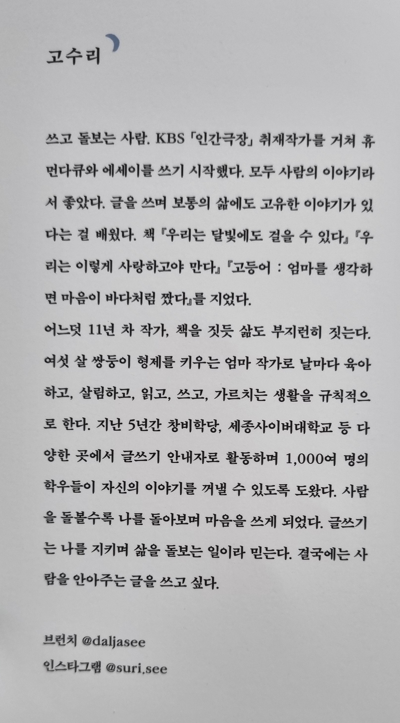 글쓰기를 가르치는 고수리 작가의 네 번째 에세이집이 나왔다. 앞의 세 권(우리는 이렇게 사랑하고야 만다, 고등어 : 엄마를 생각하면 마음이 바다처럼 짰다, 우리는 달빛에도 걸을 수 있다)에서는 진솔한 삶의 이야기로 책을 읽는 내내 얼얼하고 따스한 내용에 무척 감동받았던 기억이 난다. 이번 책에서는 글쓰기 강좌를 했던 이야기가 함께 쓰여 있어서 글쓰기를 배우는 사람들에게도 큰 도움이 될 것 같다. 글쓰기를 위한 글쓰기 책, “메타 에세이”다.