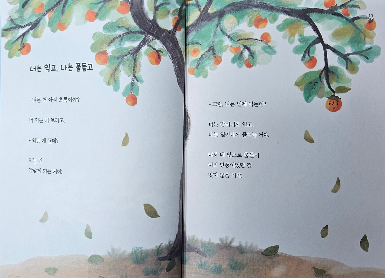 감과 감잎의 우정이 서정적으로 읽힌다. 섬세한 관찰과 사유로 빚어낸 맑은 동심이다. 곁에 있는 친구를 고마워하며 그 마음을 잊지 말자는 좋은 뜻을 알 수 있다.