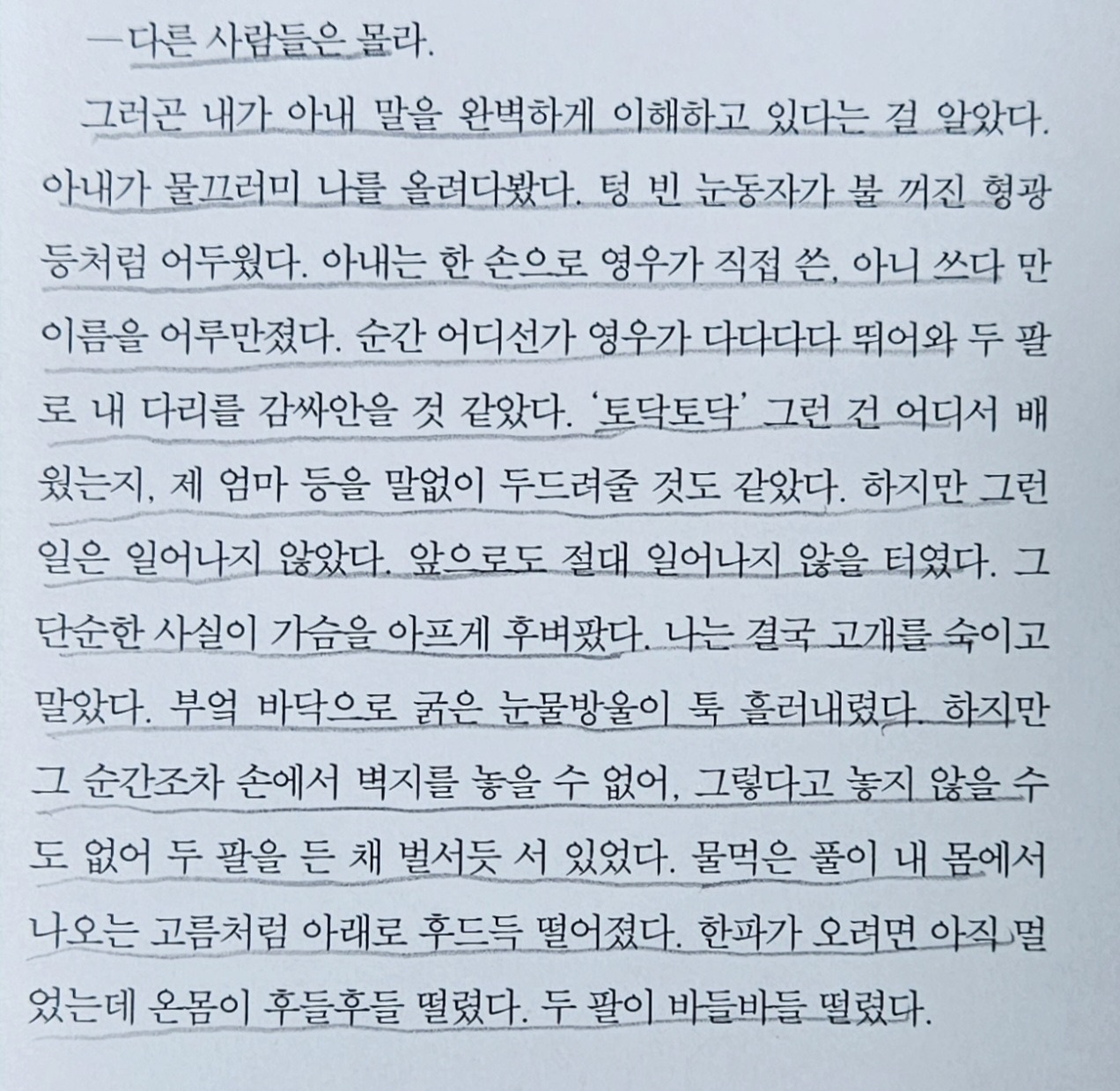 마지막 문단에서 눈물을 참을 수 없었다. 벽지를 위와 아래서 붙잡고 선 부부가 붙이지도 못하고 떨며 온몸으로 흐느끼는 장면이 훤하게, 그 처참한 마음이 그려져서 그 장면 속으로 뛰어 들어가 꼭 안아서 영우처럼 “토닥토닥” 등을 두드려 주었으면 좋겠다고 생각했다.