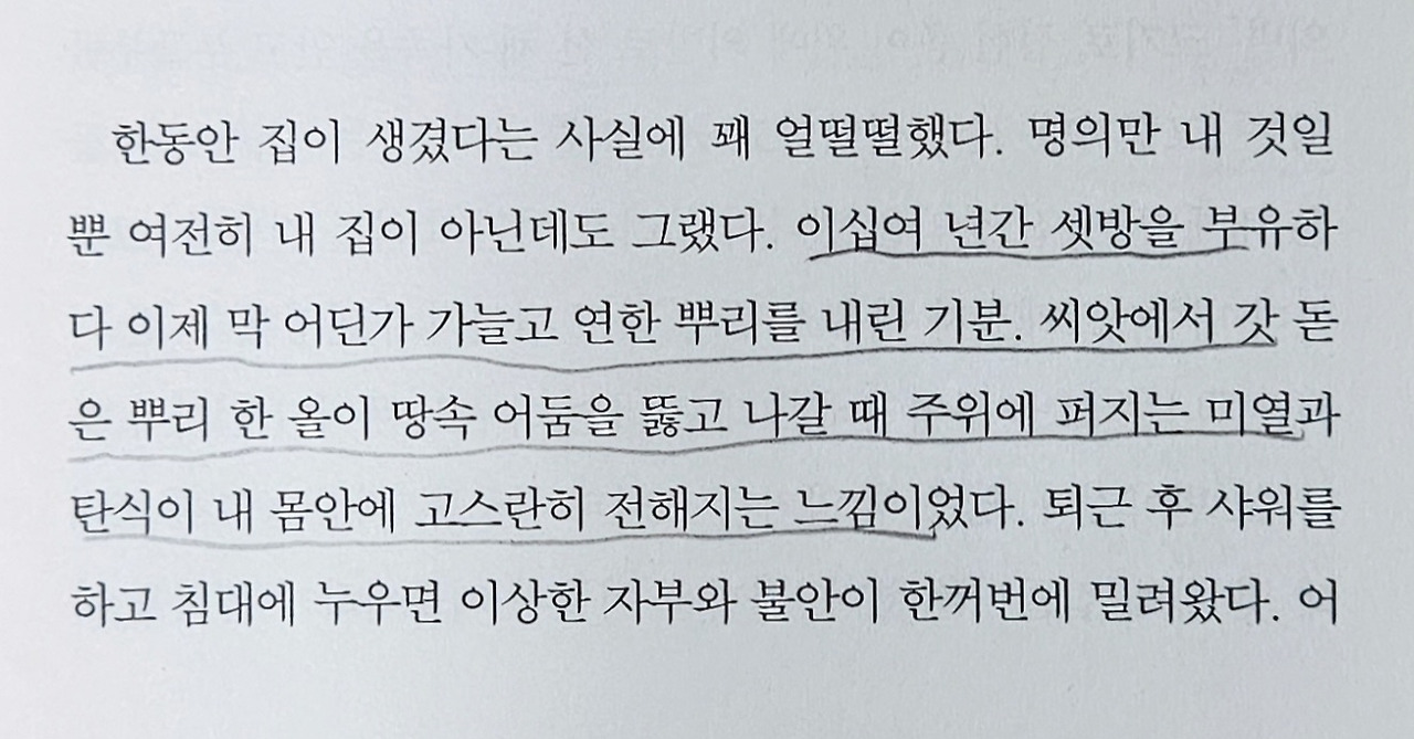 “이십여 년간 셋방을 부유하다 이제 막 어딘가 가늘고 연한 뿌리를 내린 기분. 씨앗에서 갓 돋은 뿌리 한 올이 땅속 어둠을 뚫고 나갈 대 주위에 퍼지는 미열과 탄식이 내 몸 안에 고스란히 전해지는 느낌이었다.”(p13)