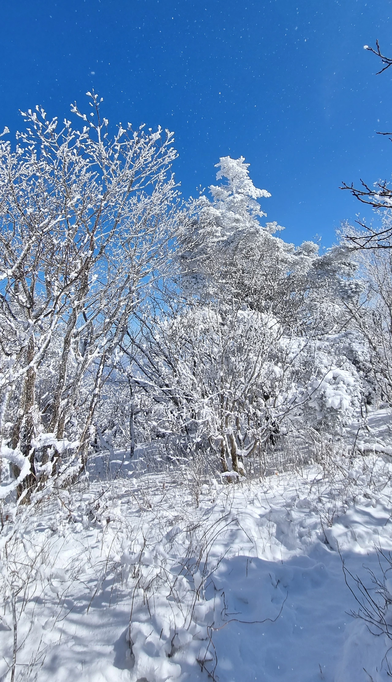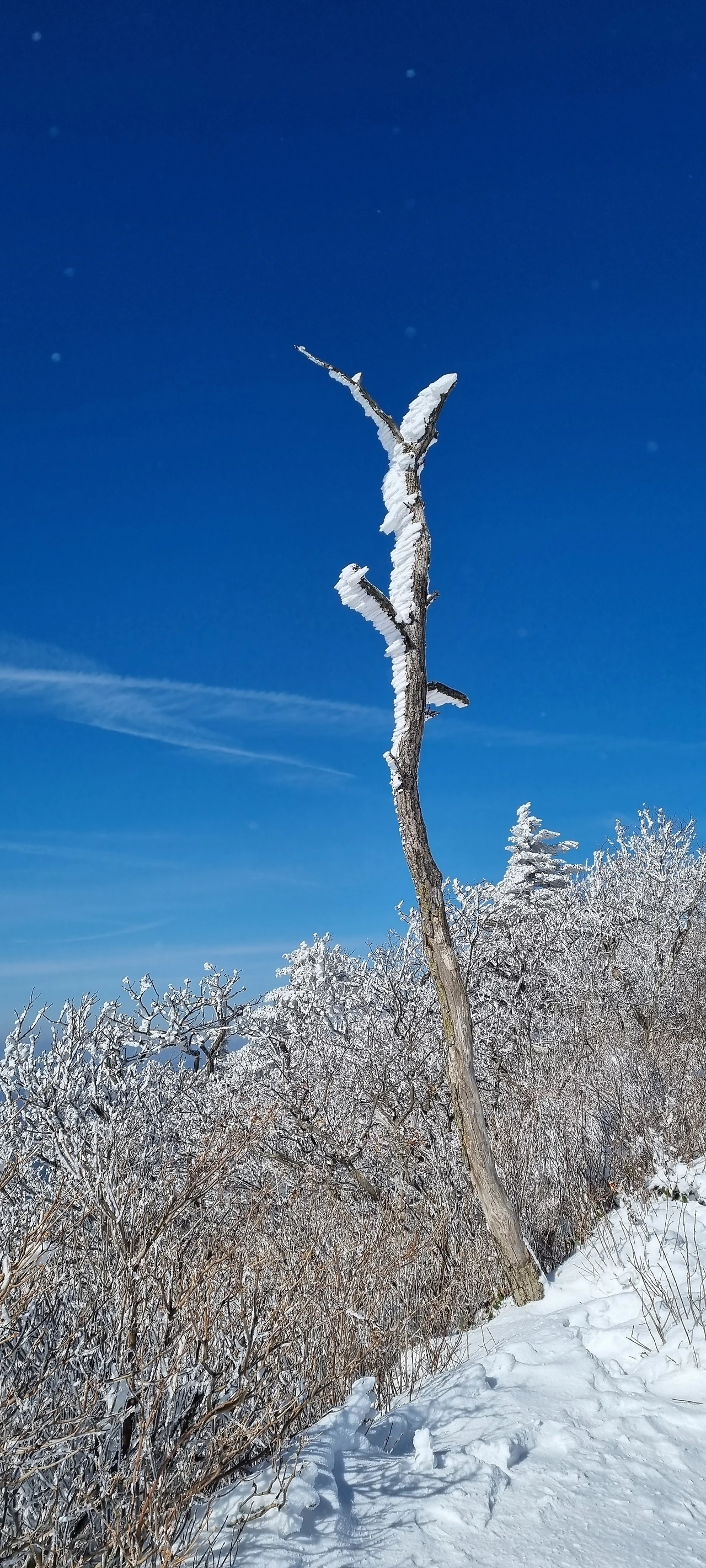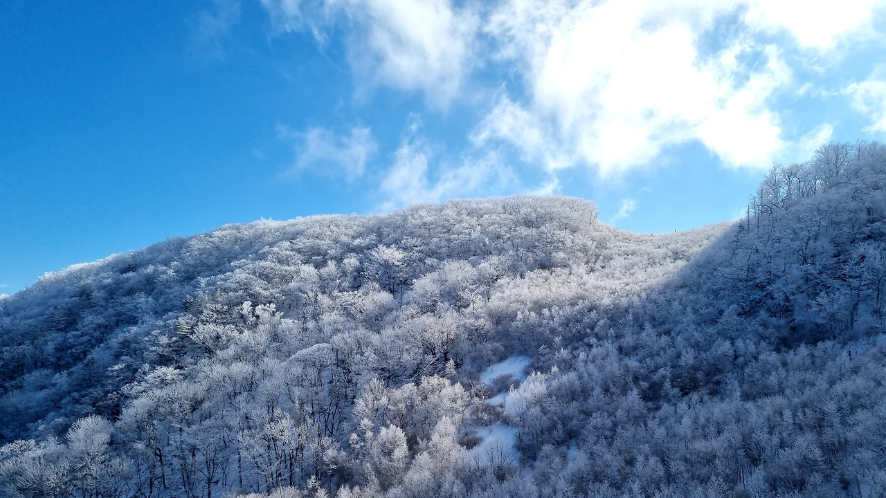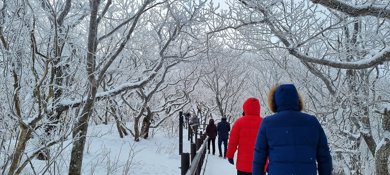 걸으면서 보이는 풍경 또한 절경이었다. 사방에 눈 쌓인 풍경이 눈꽃이 피었다고 말하면 좋을 것 같다. 추위도 잊고 한사코 위로 오르는 사람들의 표정이 나처럼 들떠 보였다. 바람에 날리는 눈가루가 반짝거려서 별이 지나가는 것 같았다. 사진을 볼 때, 육안으로도 자잘한 별을 볼 수 있다. 다행히 눈은 그치고 날씨는 맑았다.