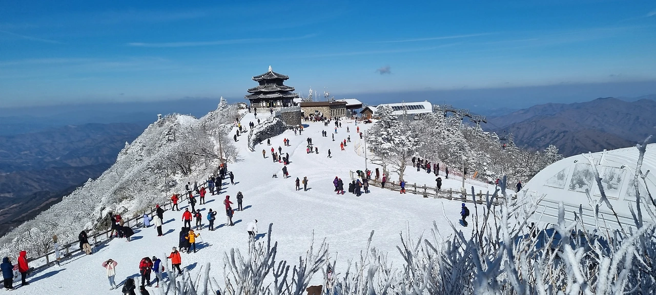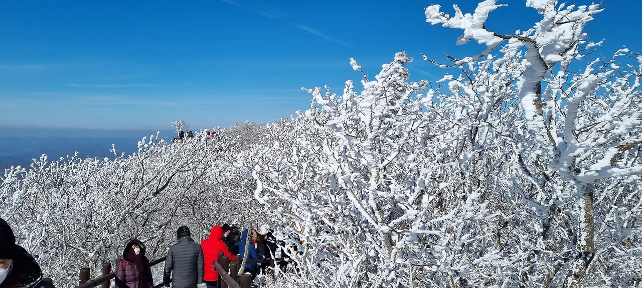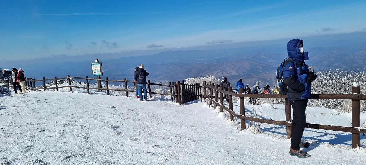 향적봉 정상에서 바로 본 풍경도 기억에 남는다. 추위를 뚫고 어렵게 오른 산이라 기념하려는 마음은 모두 똑같은 것 같았다. 표지석에서 사진을 찍으려고 길게 줄지어 선 사람들 틈에서 우리도 한참을 기다려 겨우 가족사진을 찍을 수 있었다. 한동안 카톡 프사에 올리고 다녔다.