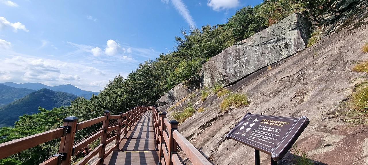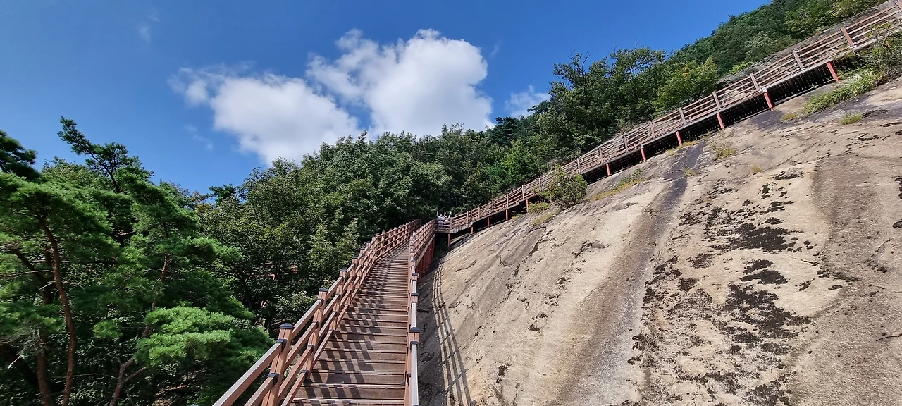 바위에 데크길을 만든 길을 잔도라고 하는 것도 처음 알았다. (잔도 : 험한 벼랑 같은 곳에 낸 길. 선반처럼 달아서 낸다) 휴가 첫날에 해남의 달마고도 순례길을 걸었던 후유증으로 온몸이 아파서 걷기 힘들었다. 당일 오전에 근처에 있는 체계산에 오를 때, 나는 함께 오르지 못했다. 그전에 둘째랑 다녀오기도 했었지만, 용궐산 하늘길을 꼭 가고 싶어서 체력을 비축해야 했다. 오전 일정으로 인해 아이들은 벌써, 지쳐 있었다. 용궐산 입구의 휴양관에서 점심을 해결하고 산길로 향했다. 10분쯤 걷자 잔도가 시작되었다.
