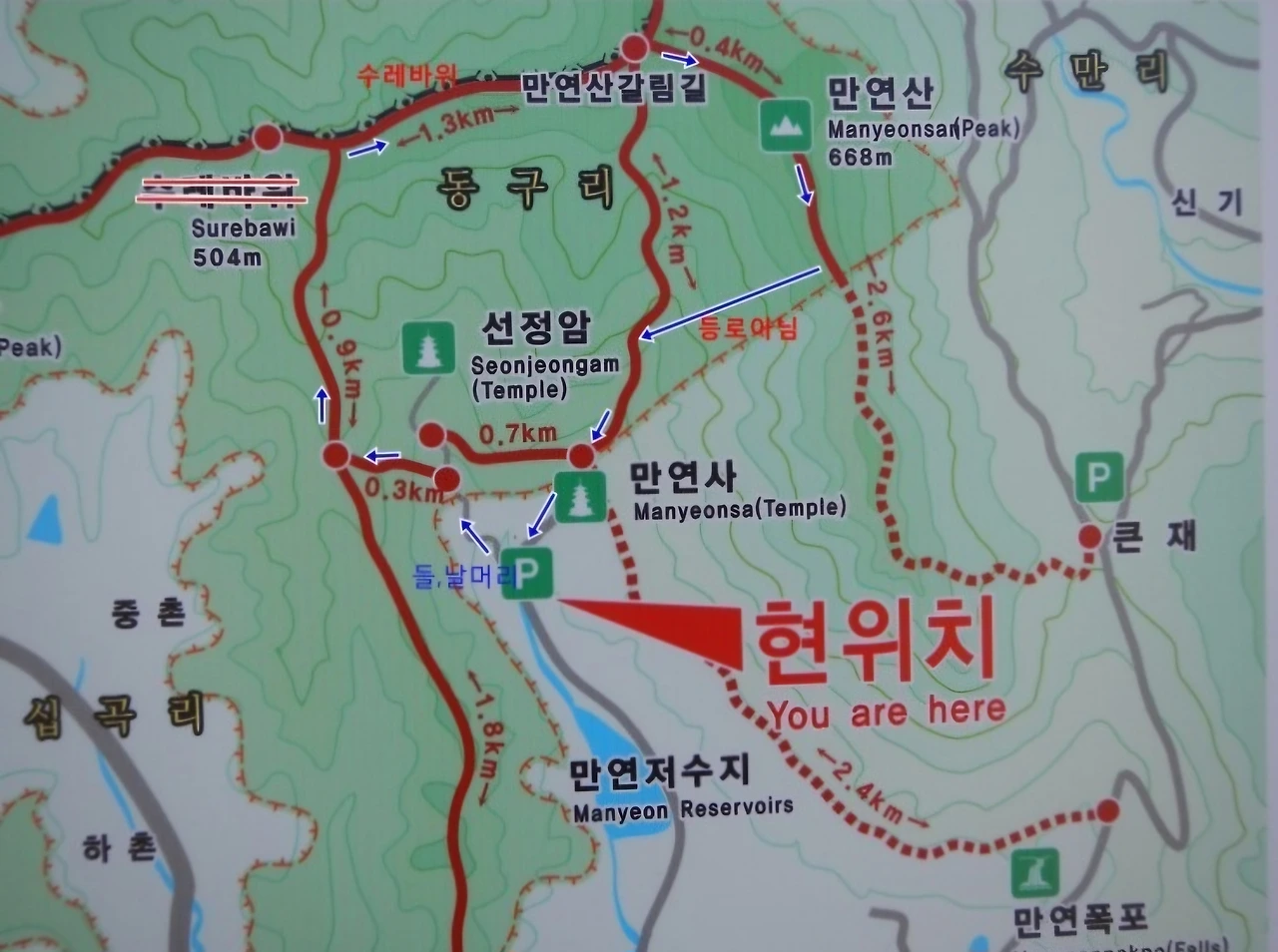 만연산 등산에서는 5시간 정도 예상보다 다소 시간이 많이 소요되었지만, 등산을 시작하는 초입에서 경사가 심한 편이라 힘들었다. 남편의 말에 의하면, 내가 엄청 힘들어하면서 올랐다고 한다. 사흘 연속 등산에 힘들지 않다면 그게 전문 산악인이 아니고서야 어찌... 한 바퀴 돌아서 수만리 쪽으로 내려왔다.