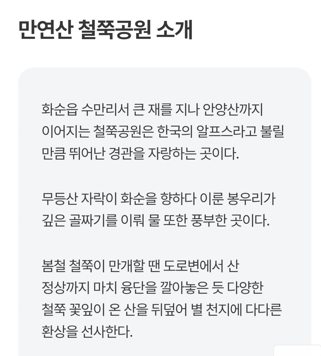 수만리 방향의 무등산 철쭉 공원은 봄에 아름다움을 더해서 사람들의 발길을 이끄는 관광명소다. 만연산 등산은 체력적 소진을 가져왔지만, 정신적 힘을 충전하는 계기가 되었다.